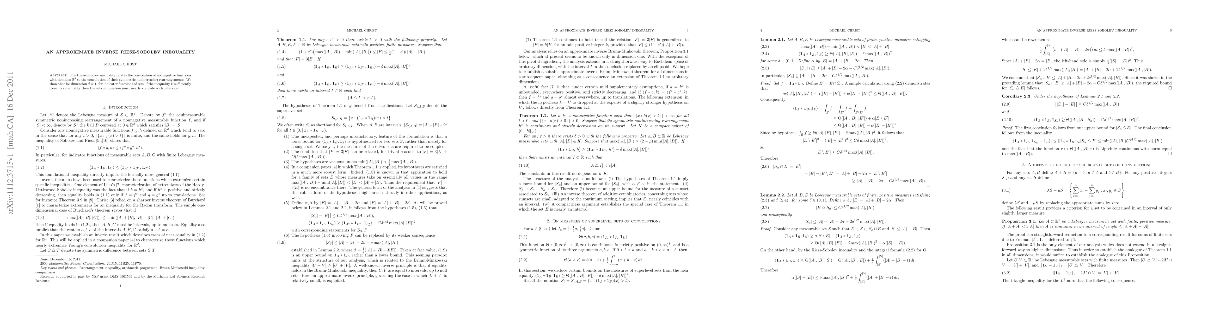 Summary: This paper demonstrates that for dimension one, when the Riesz-Sobolev inequality nearly holds for indicator functions of sets, the sets must almost coincide with intervals. The result provides insight into the geometric structure of sets under this inequality.