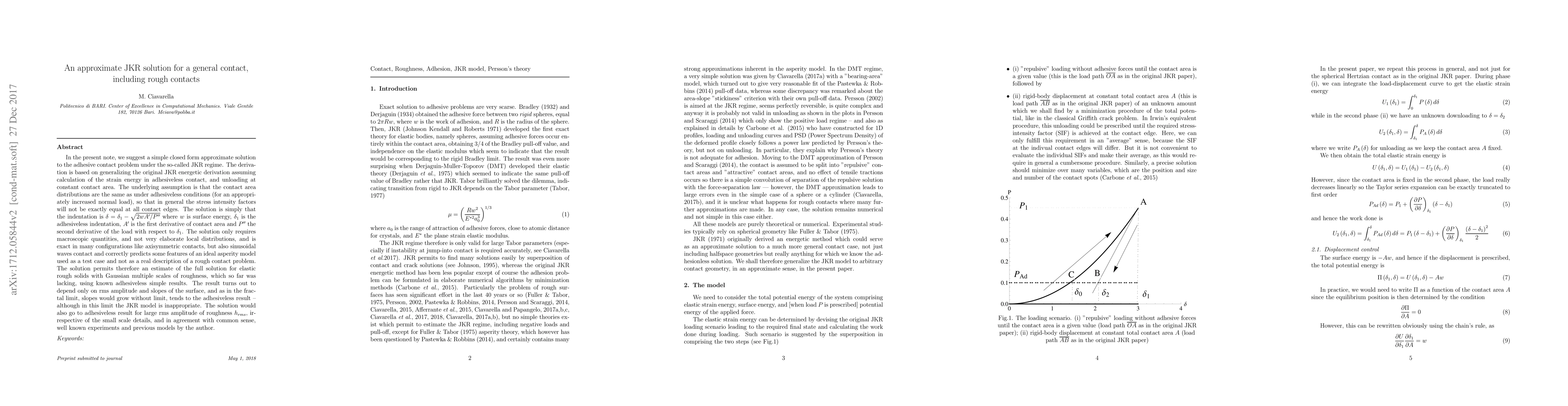 Researchers developed a simplified solution for adhesive contact problems under JKR regime, which assumes constant contact area during unloading, requiring only macroscopic quantities and neglecting local distributions, allowing for estimates in rough solids with Gaussian multiple scales of roughness.
