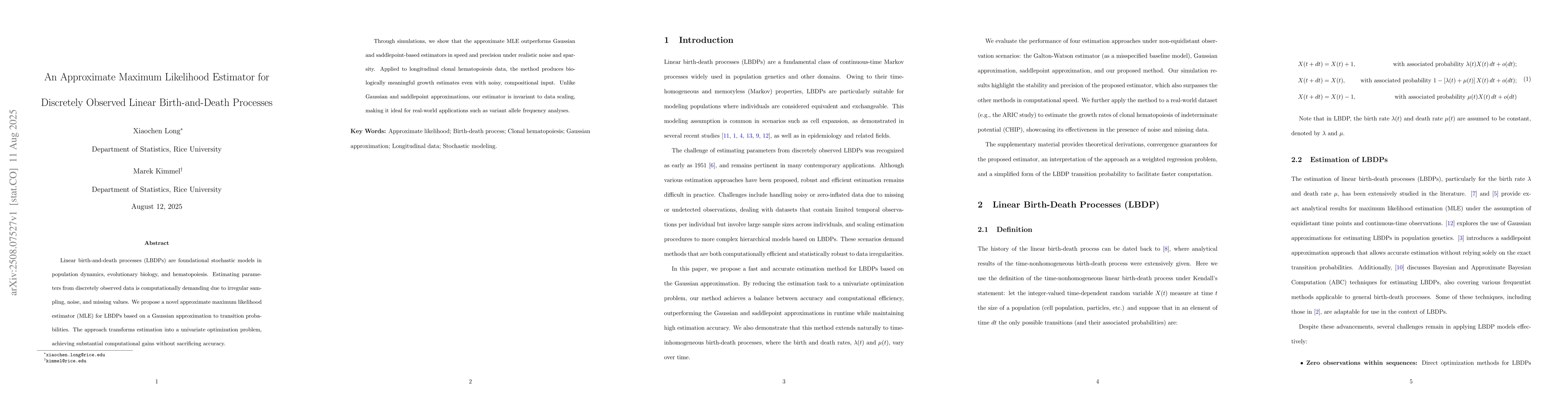 Linear birth-and-death processes (LBDPs) are foundational stochastic models in population dynamics, evolutionary biology, and hematopoiesis. Estimating parameters from discretely observed data is computationally demanding due to irregular sampling, noise, and missing values. We propose a novel approximate maximum likelihood estimator (MLE) for LBDPs based on a Gaussian approximation to transition probabilities. The approach transforms estimation into a univariate optimization problem, achieving substantial computational gains without sacrificing accuracy. Through simulations, we show that the approximate MLE outperforms Gaussian and saddlepoint-based estimators in speed and precision under realistic noise and sparsity. Applied to longitudinal clonal hematopoiesis data, the method produces biologically meaningful growth estimates even with noisy, compositional input. Unlike Gaussian and saddlepoint approximations, our estimator is invariant to data scaling, making it ideal for real-world applications such as variant allele frequency analyses.