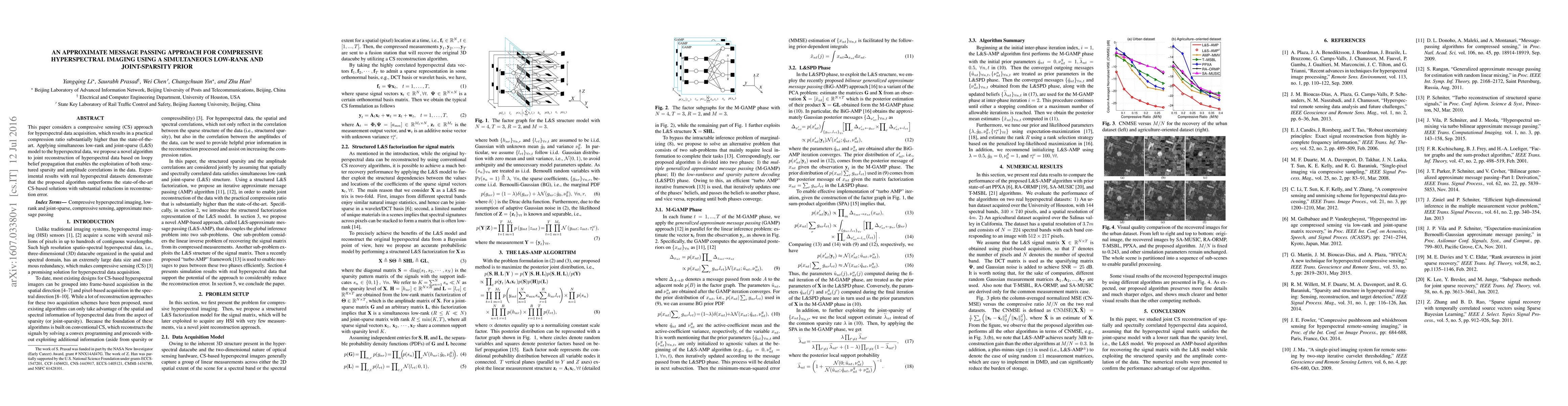 This paper considers a compressive sensing (CS) approach for hyperspectral data acquisition, which results in a practical compression ratio substantially higher than the state-of-the-art. Applying simultaneous low-rank and joint-sparse (L&S) model to the hyperspectral data, we propose a novel algorithm to joint reconstruction of hyperspectral data based on loopy belief propagation that enables the exploitation of both structured sparsity and amplitude correlations in the data. Experimental results with real hyperspectral datasets demonstrate that the proposed algorithm outperforms the state-of-the-art CS-based solutions with substantial reductions in reconstruction error.