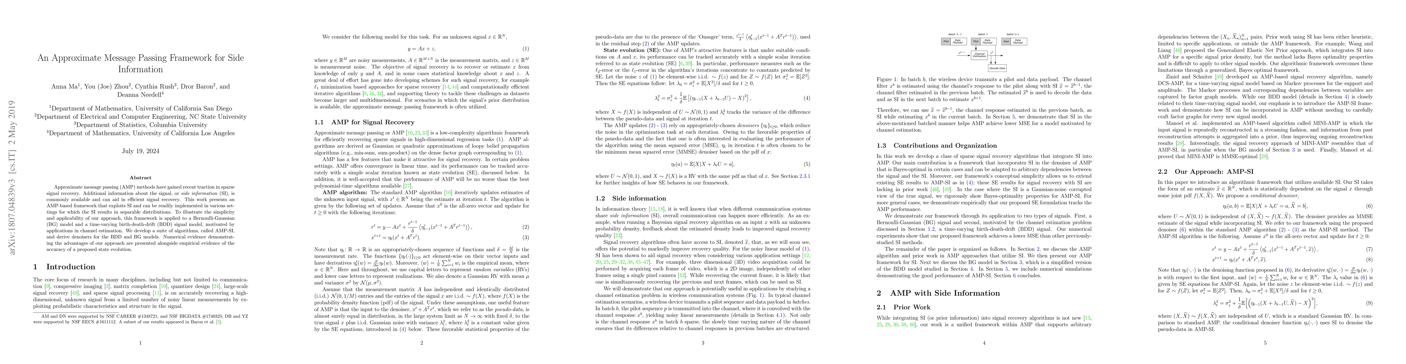 Approximate message passing (AMP) methods have gained recent traction in sparse signal recovery. Additional information about the signal, or \emph{side information} (SI), is commonly available and can aid in efficient signal recovery. This work presents an AMP-based framework that exploits SI and can be readily implemented in various settings for which the SI results in separable distributions. To illustrate the simplicity and applicability of our approach, this framework is applied to a Bernoulli-Gaussian (BG) model and a time-varying birth-death-drift (BDD) signal model, motivated by applications in channel estimation. We develop a suite of algorithms, called AMP-SI, and derive denoisers for the BDD and BG models. Numerical evidence demonstrating the advantages of our approach are presented alongside empirical evidence of the accuracy of a proposed state evolution.