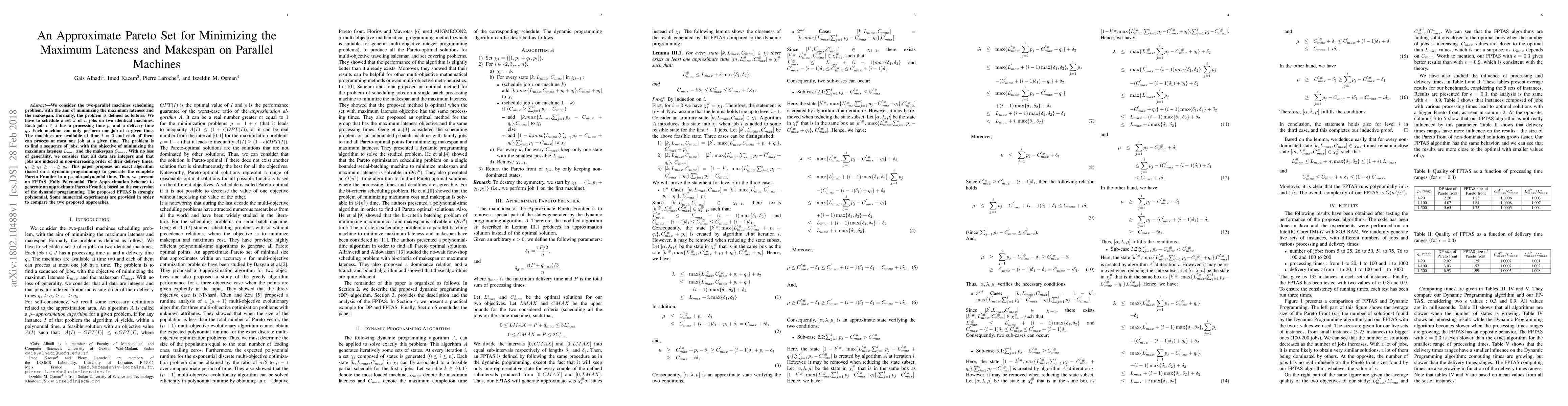 This paper proposes an exact algorithm for minimizing maximum lateness and makespan on parallel machines, and a fully polynomial time approximation scheme (FPTAS) to generate an approximate Pareto Frontier in pseudo-polynomial time.