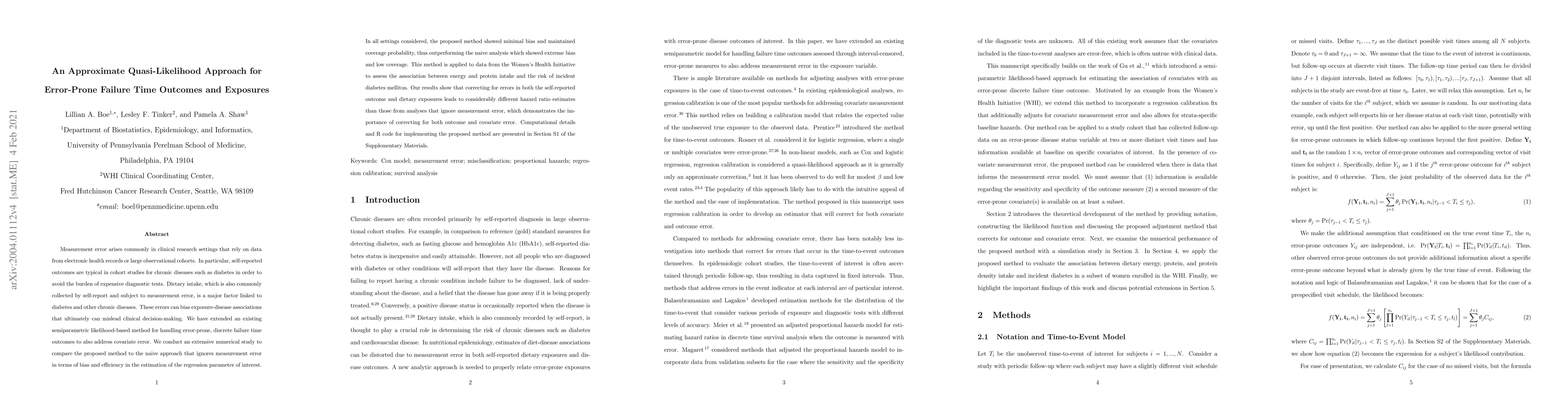 This paper proposes an approximate quasi-likelihood approach to handle measurement error in both self-reported failure time outcomes and exposure variables, such as dietary intake, in clinical research. The method outperforms naive approaches that ignore measurement error, demonstrating reduced bias and better coverage probability in numerical studies.
