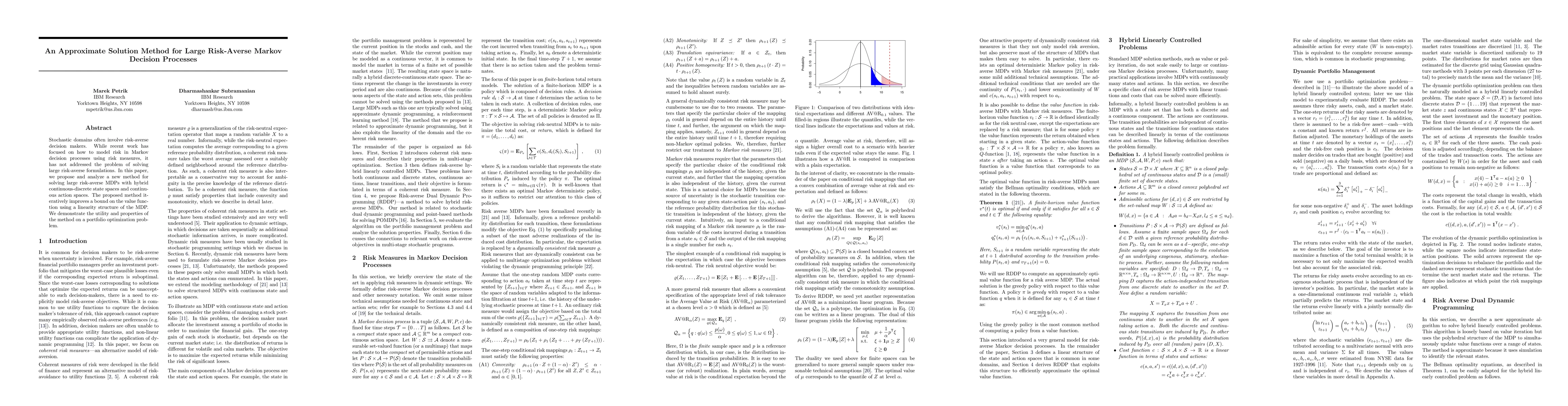 This paper introduces a new method for solving large risk-averse Markov Decision Processes (MDPs) with hybrid state spaces. It iteratively refines a value function bound leveraging MDP linearity, and validates the approach through a portfolio optimization example.