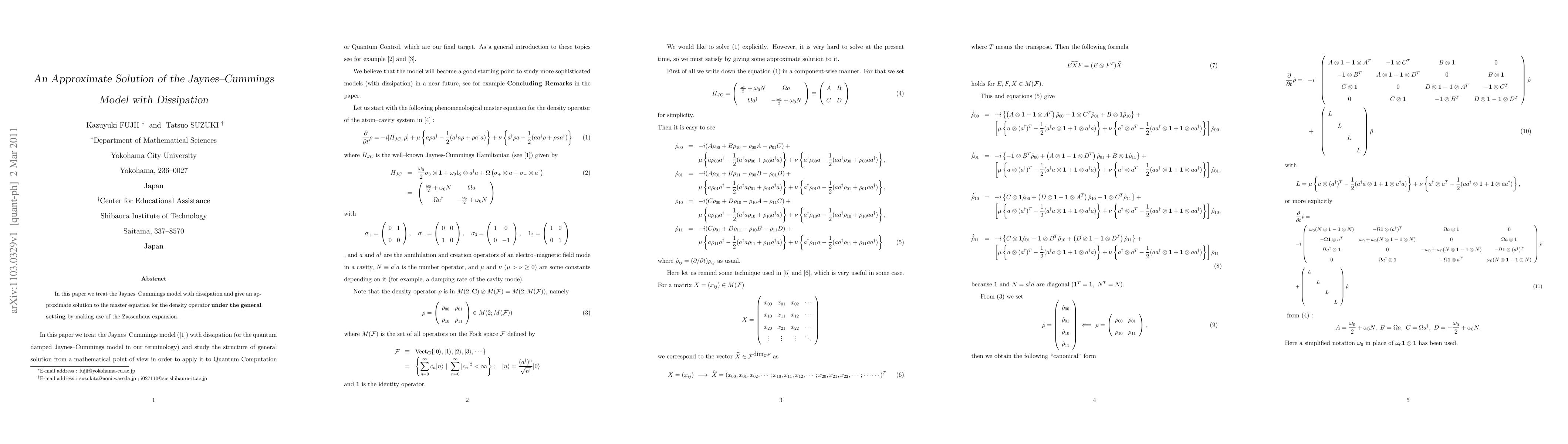 This paper provides an approximate solution to the Jaynes-Cummings model with dissipation using the Zassenhaus expansion to solve the master equation for the density operator under general conditions. The approach aims to simplify the dynamics of the system while accounting for dissipative effects.