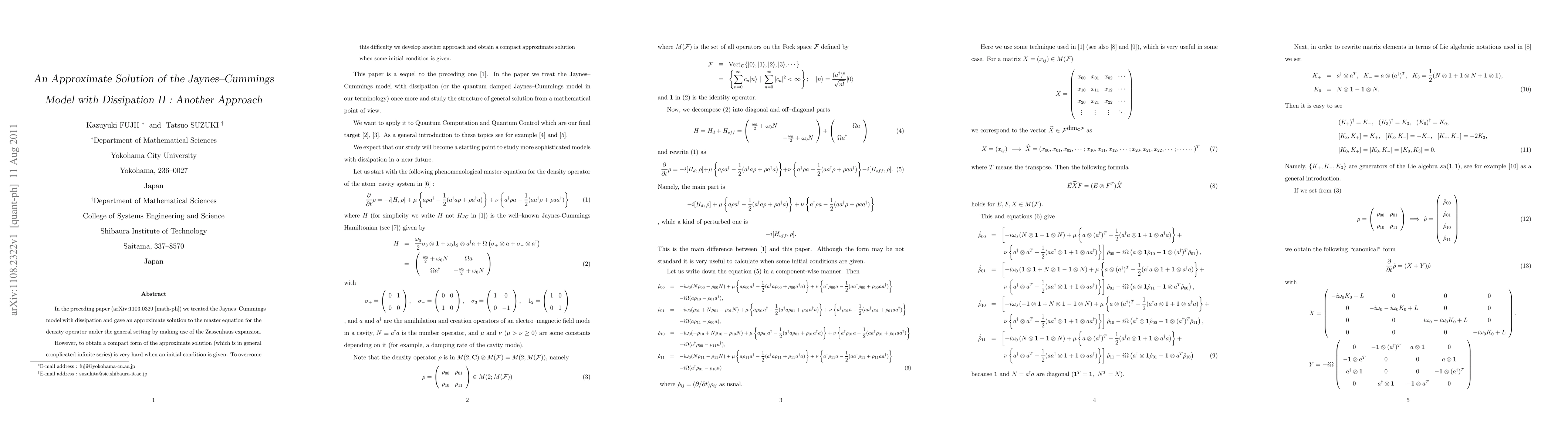This paper presents an alternative method to derive a more compact approximate solution for the Jaynes-Cummings model with dissipation, addressing the complexity of infinite series solutions obtained in a previous study. The new approach aims to simplify the solution when specific initial conditions are provided.