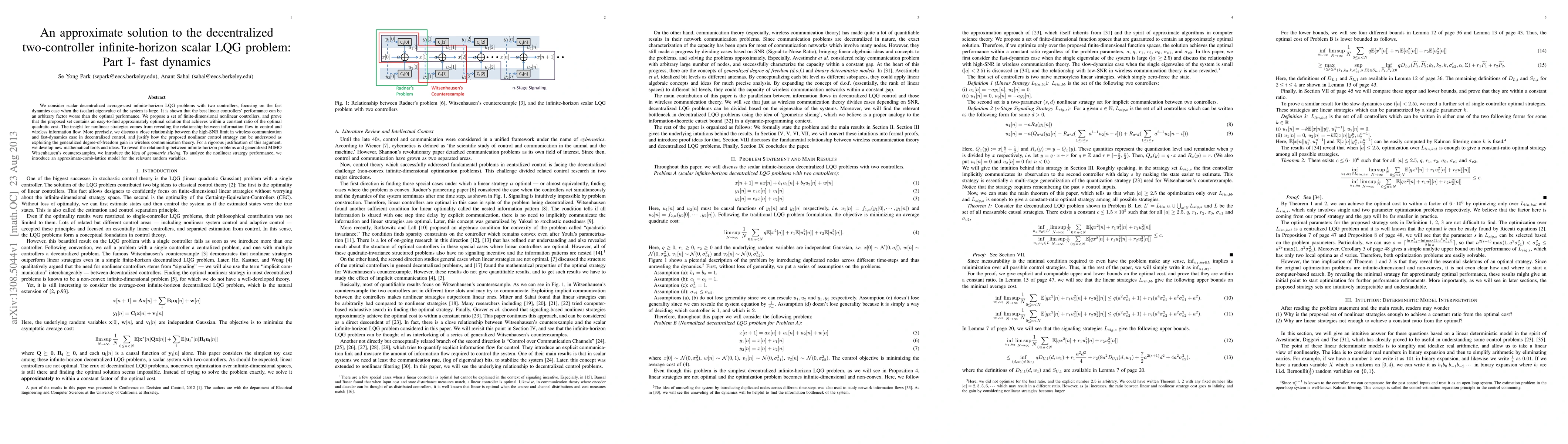 This paper addresses decentralized infinite-horizon LQG problems with two controllers, focusing on scenarios with fast dynamics. It proposes a set of nonlinear controllers that achieve near-optimal performance, leveraging insights from wireless communication theory, and introduces new mathematical tools to analyze their effectiveness.