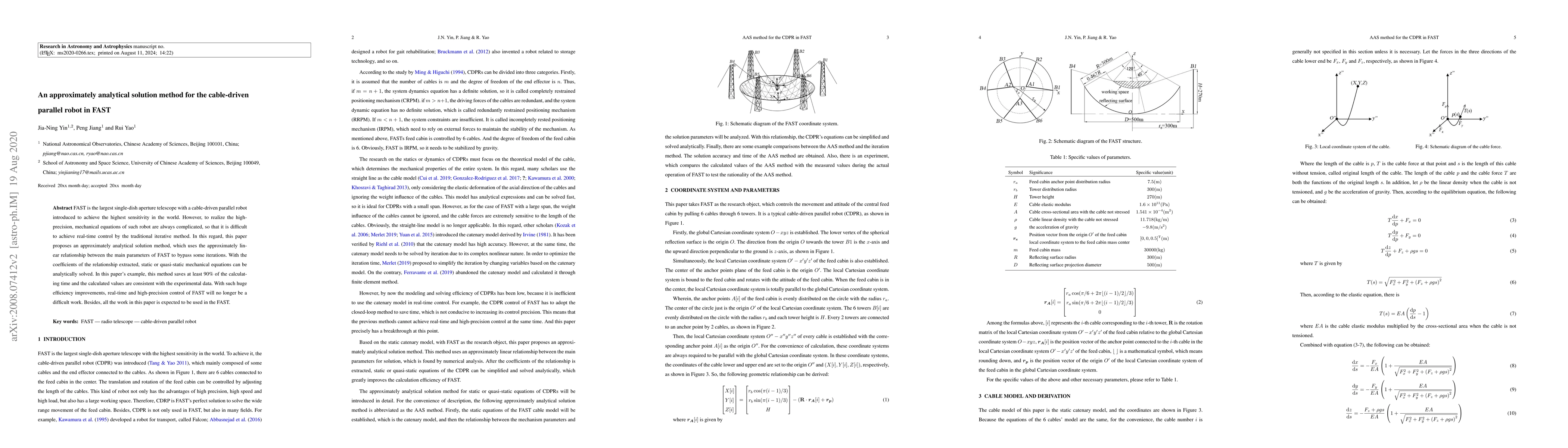 FAST is the largest single-dish aperture telescope with a cable-driven parallel robot introduced to achieve the highest sensitivity in the world. However, to realize the high-precision, mechanical equations of such robot are always complicated, so that it is difficult to achieve real-time control by the traditional iterative method. In this regard, this paper proposes an approximately analytical solution method, which uses the approximately linear relationship between the main parameters of FAST to bypass some iterations. With the coefficients of the relationship extracted, static or quasi-static mechanical equations can be analytically solved. In this paper's example, this method saves at least 90% of the calculating time and the calculated values are consistent with the experimental data. With such huge efficiency improvements, real-time and high-precision control of FAST will no longer be a difficult work. Besides, all the work in this paper is expected to be used in the FAST.