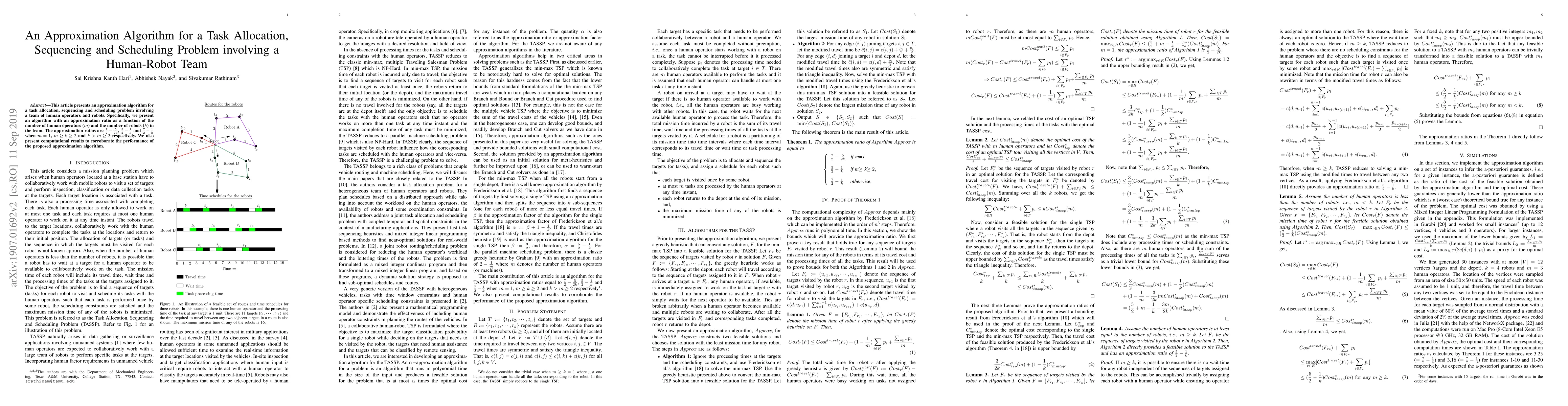 This paper presents an approximation algorithm for optimizing task allocation, sequencing, and scheduling in human-robot teams with varying numbers of human operators and robots, achieving certain approximation ratios.