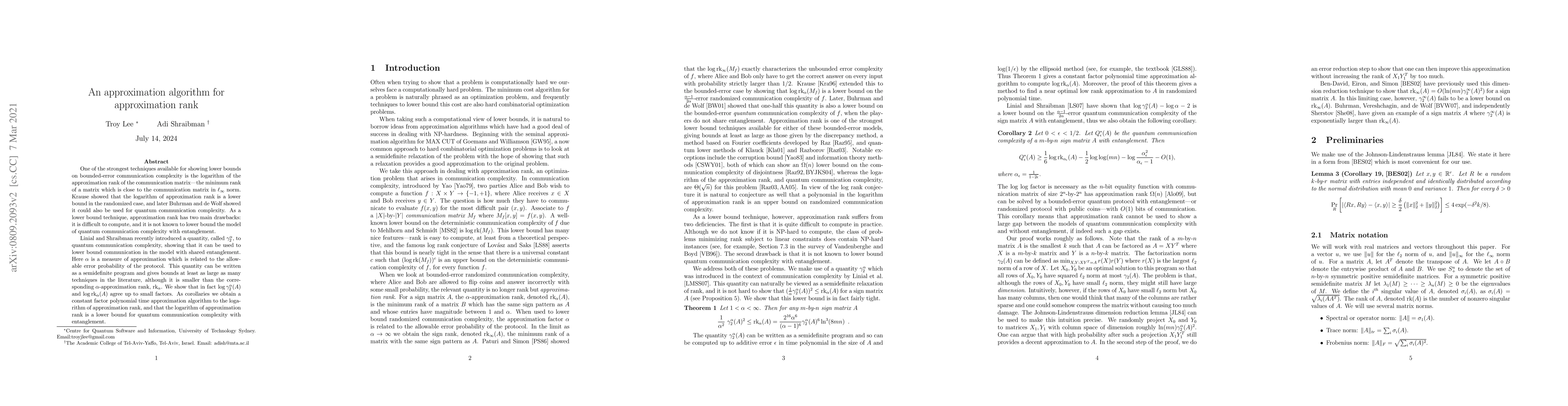 One of the strongest techniques available for showing lower bounds on quantum communication complexity is the logarithm of the approximation rank of the communication matrix--the minimum rank of a matrix which is entrywise close to the communication matrix. This technique has two main drawbacks: it is difficult to compute, and it is not known to lower bound quantum communication complexity with entanglement. Linial and Shraibman recently introduced a norm, called gamma_2^{alpha}, to quantum communication complexity, showing that it can be used to lower bound communication with entanglement. Here the parameter alpha is a measure of approximation which is related to the allowable error probability of the protocol. This bound can be written as a semidefinite program and gives bounds at least as large as many techniques in the literature, although it is smaller than the corresponding alpha-approximation rank, rk_alpha. We show that in fact log gamma_2^{alpha}(A)$ and log rk_{alpha}(A)$ agree up to small factors. As corollaries we obtain a constant factor polynomial time approximation algorithm to the logarithm of approximate rank, and that the logarithm of approximation rank is a lower bound for quantum communication complexity with entanglement.