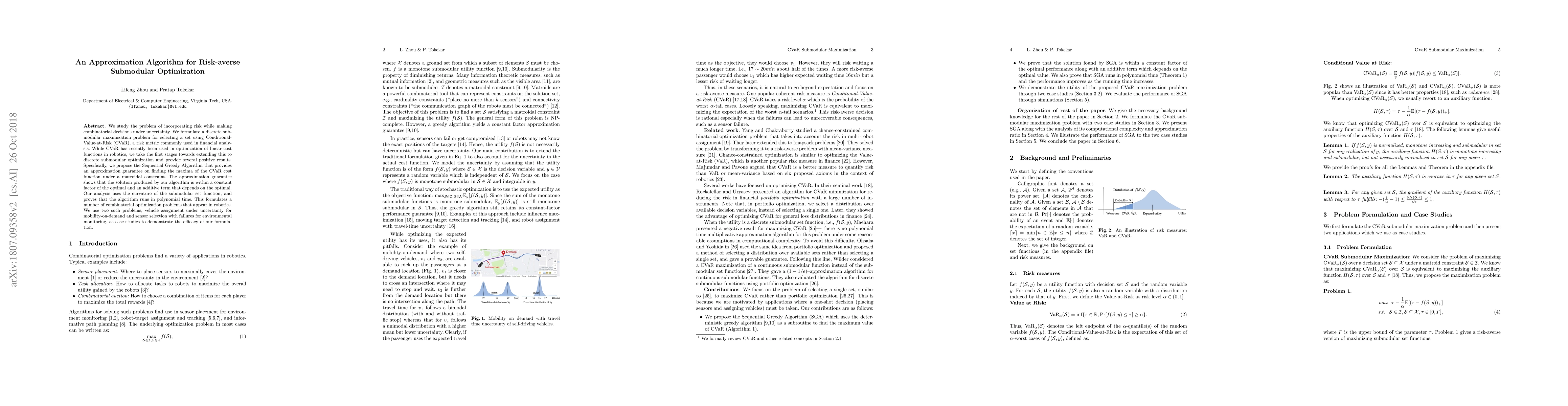 We study the problem of incorporating risk while making combinatorial decisions under uncertainty. We formulate a discrete submodular maximization problem for selecting a set using Conditional-Value-at-Risk (CVaR), a risk metric commonly used in financial analysis. While CVaR has recently been used in optimization of linear cost functions in robotics, we take the first stages towards extending this to discrete submodular optimization and provide several positive results. Specifically, we propose the Sequential Greedy Algorithm that provides an approximation guarantee on finding the maxima of the CVaR cost function under a matroidal constraint. The approximation guarantee shows that the solution produced by our algorithm is within a constant factor of the optimal and an additive term that depends on the optimal. Our analysis uses the curvature of the submodular set function, and proves that the algorithm runs in polynomial time. This formulates a number of combinatorial optimization problems that appear in robotics. We use two such problems, vehicle assignment under uncertainty for mobility-on-demand and sensor selection with failures for environmental monitoring, as case studies to demonstrate the efficacy of our formulation.