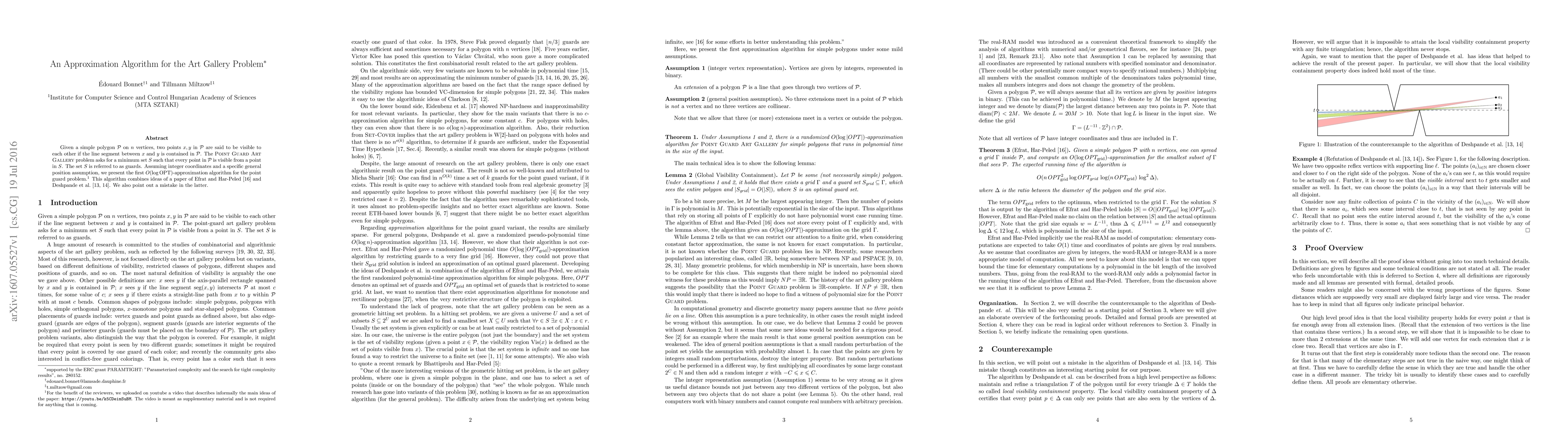 Given a simple polygon $\mathcal{P}$ on $n$ vertices, two points $x,y$ in $\mathcal{P}$ are said to be visible to each other if the line segment between $x$ and $y$ is contained in $\mathcal{P}$. The Point Guard Art Gallery problem asks for a minimum set $S$ such that every point in $\mathcal{P}$ is visible from a point in $S$. The set $S$ is referred to as guards. Assuming integer coordinates and a specific general position assumption, we present the first $O(\log \text{OPT})$-approximation algorithm for the point guard problem for simple polygons. This algorithm combines ideas of a paper of Efrat and Har-Peled [Inf. Process. Lett. 2006] and Deshpande et. al. [WADS 2007]. We also point out a mistake in the latter.
