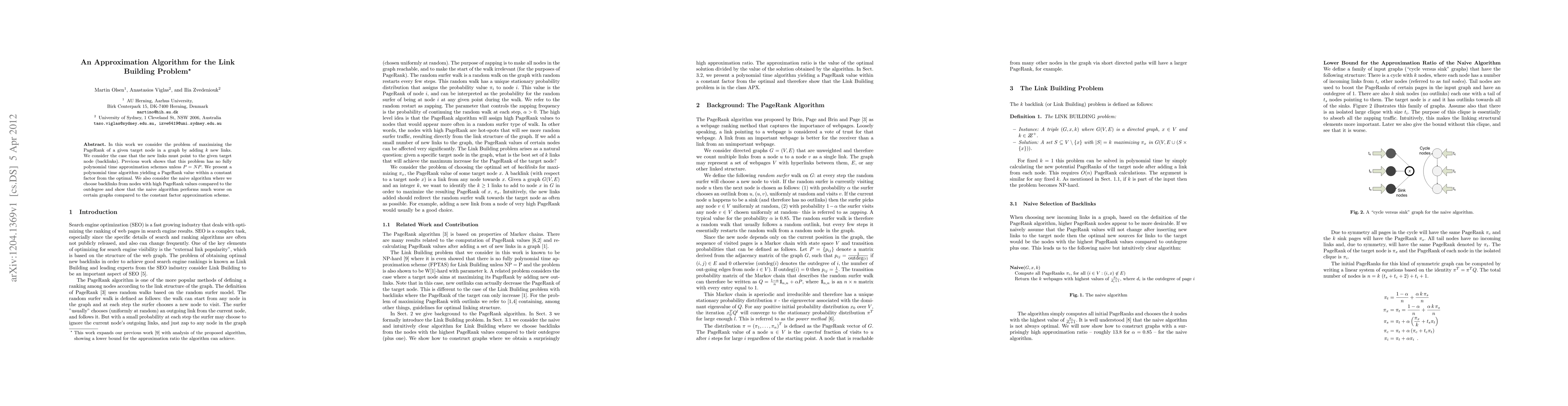 A new algorithm has been developed to maximize a target node's PageRank in a graph by adding k new links, improving upon the performance of a naive algorithm that chooses high-Rank nodes with low outdegree.
