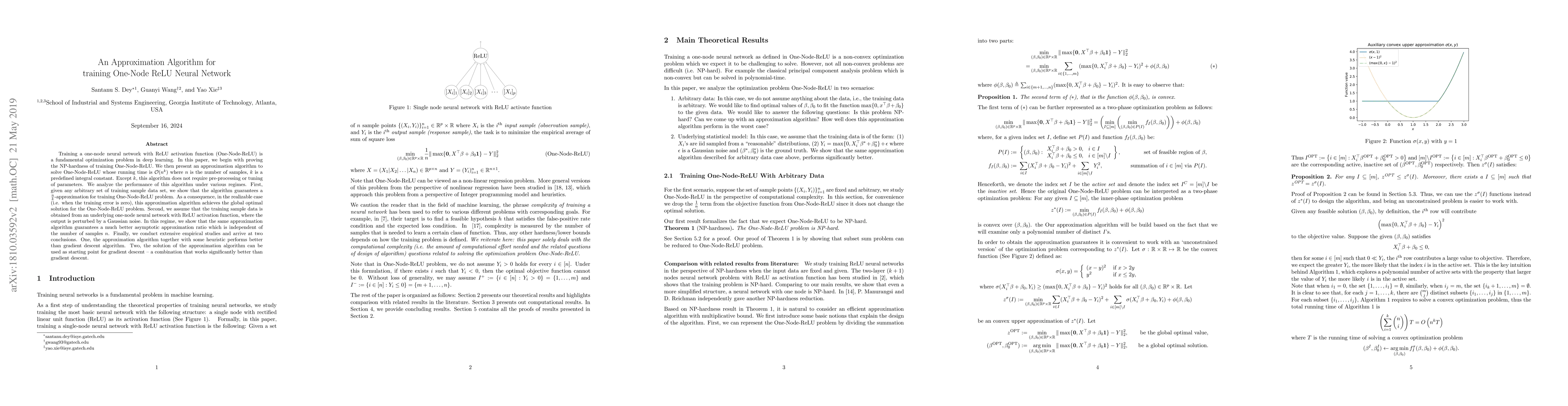 Training a one-node neural network with ReLU activation function (One-Node-ReLU) is a fundamental optimization problem in deep learning. In this paper, we begin with proving the NP-hardness of training One-Node-ReLU. We then present an approximation algorithm to solve One-Node-ReLU whose running time is $\mathcal{O}(n^k)$ where $n$ is the number of samples, $k$ is a predefined integral constant. Except $k$, this algorithm does not require pre-processing or tuning of parameters. We analyze the performance of this algorithm under various regimes. First, given any arbitrary set of training sample data set, we show that the algorithm guarantees a $\frac{n}{k}$-approximation for training One-Node-ReLU problem. As a consequence, in the realizable case (i.e. when the training error is zero), this approximation algorithm achieves the global optimal solution for the One-Node-ReLU problem. Second, we assume that the training sample data is obtained from an underlying one-node neural network with ReLU activation function, where the output is perturbed by a Gaussian noise. In this regime, we show that the same approximation algorithm guarantees a much better asymptotic approximation ratio which is independent of the number of samples $n$. Finally, we conduct extensive empirical studies and arrive at two conclusions. One, the approximation algorithm together with some heuristic performs better than gradient descent algorithm. Two, the solution of the approximation algorithm can be used as starting point for gradient descent -- a combination that works significantly better than gradient descent.