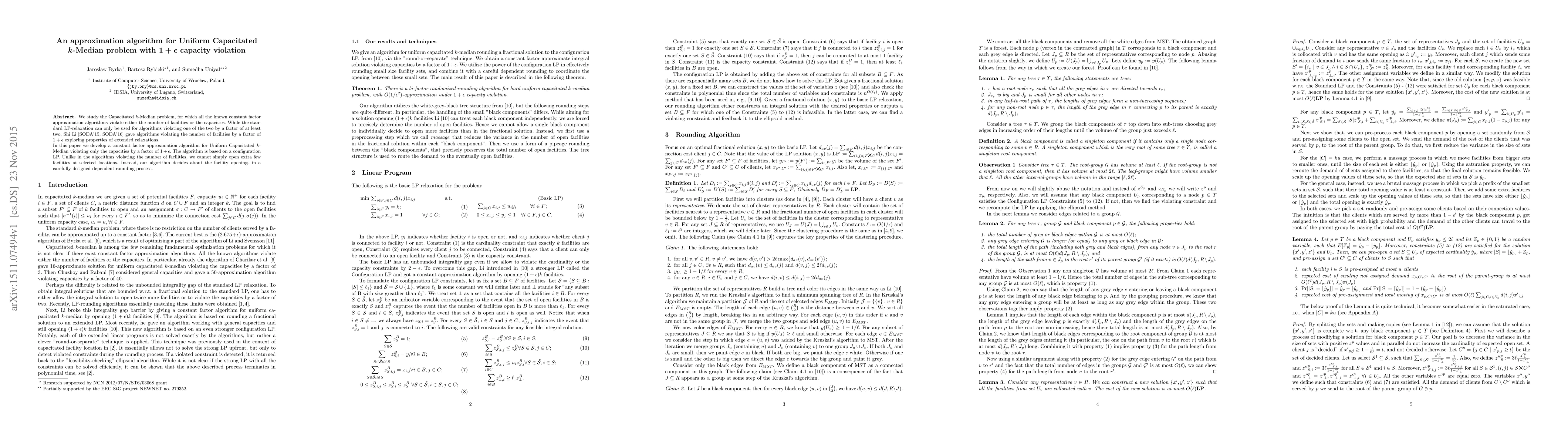 This paper presents a constant factor approximation algorithm for the Uniform Capacitated k-Median problem, allowing a capacity violation of 1+ε. Unlike previous methods that violate the number of facilities, this algorithm carefully rounds facility openings to manage capacity violations while maintaining efficiency.