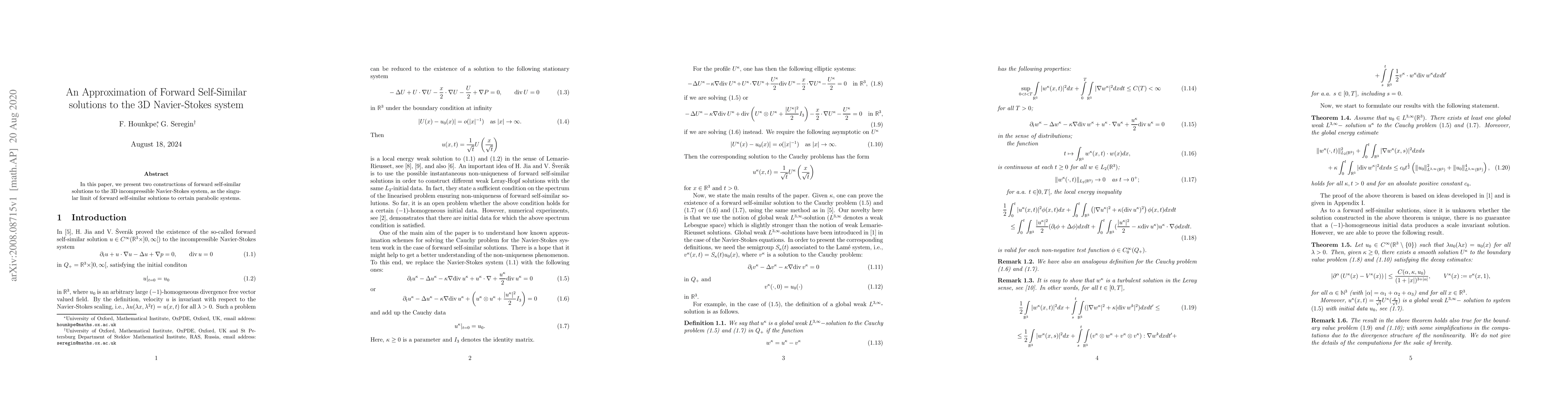 Summary: This paper constructs two forward self-similar solutions to the 3D incompressible Navier-Stokes system, approximating them as the singular limit of solutions from related parabolic systems.