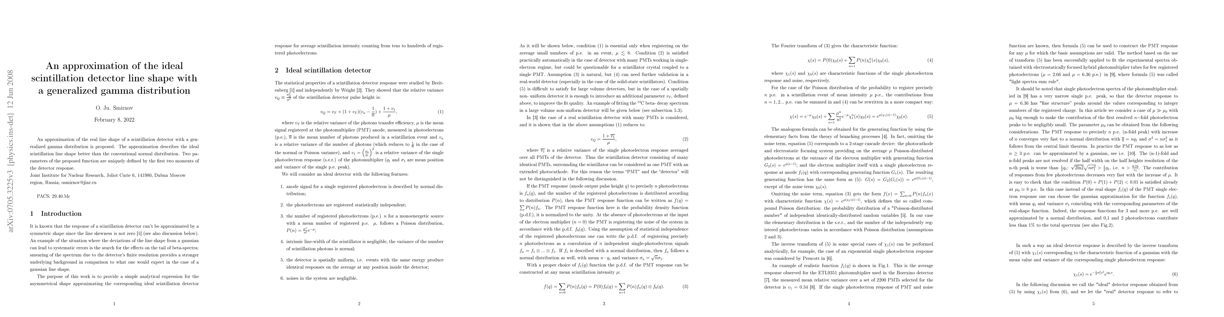 This paper proposes using a generalized gamma distribution to better approximate the ideal line shape of a scintillation detector compared to the conventional normal distribution. The approximation is defined by the first two moments of the detector response.