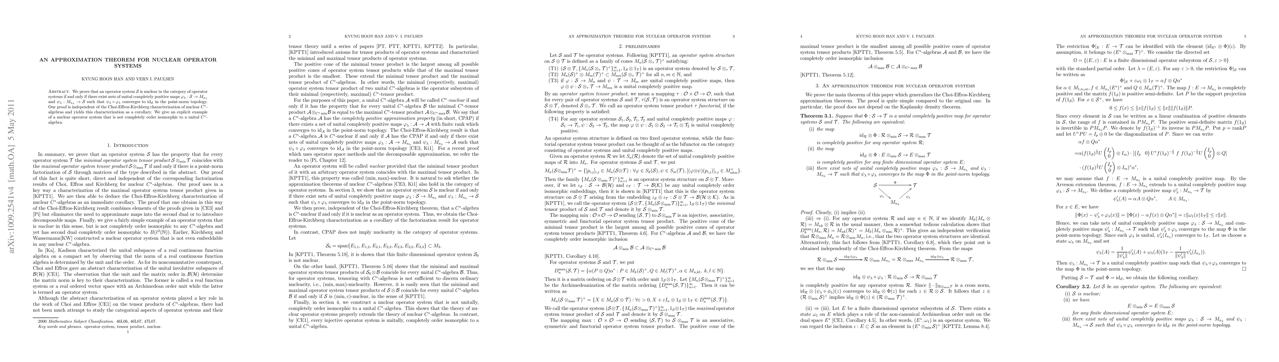 We prove that an operator system $\mathcal S$ is nuclear in the category of operator systems if and only if there exist nets of unital completely positive maps $\phi_\lambda : \cl S \to M_{n_\lambda}$ and $\psi_\lambda : M_{n_\lambda} \to \cl S$ such that $\psi_\lambda \circ \phi_\lambda$ converges to ${\rm id}_{\cl S}$ in the point-norm topology. Our proof is independent of the Choi-Effros-Kirchberg characterization of nuclear $C^*$-algebras and yields this characterization as a corollary. We give an example of a nuclear operator system that is not completely order isomorphic to a unital $C^*$-algebra.