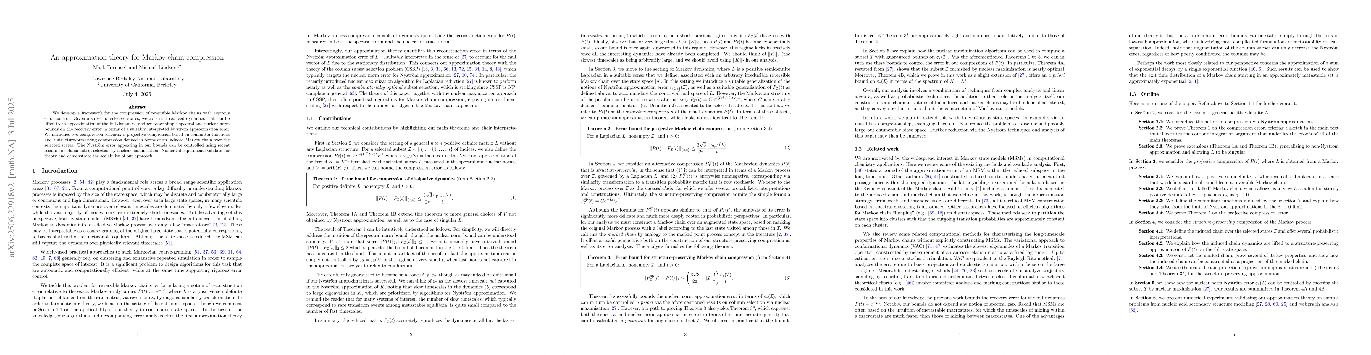 We develop a framework for the compression of reversible Markov chains with rigorous error control. Given a subset of selected states, we construct reduced dynamics that can be lifted to an approximation of the full dynamics, and we prove simple spectral and nuclear norm bounds on the recovery error in terms of a suitably interpreted Nystr\"{o}m approximation error. We introduce two compression schemes: a projective compression based on committor functions and a structure-preserving compression defined in terms of an induced Markov chain over the selected states. The Nystr\"{o}m error appearing in our bounds can be controlled using recent results on column subset selection by nuclear maximization. Numerical experiments validate our theory and demonstrate the scalability of our approach.