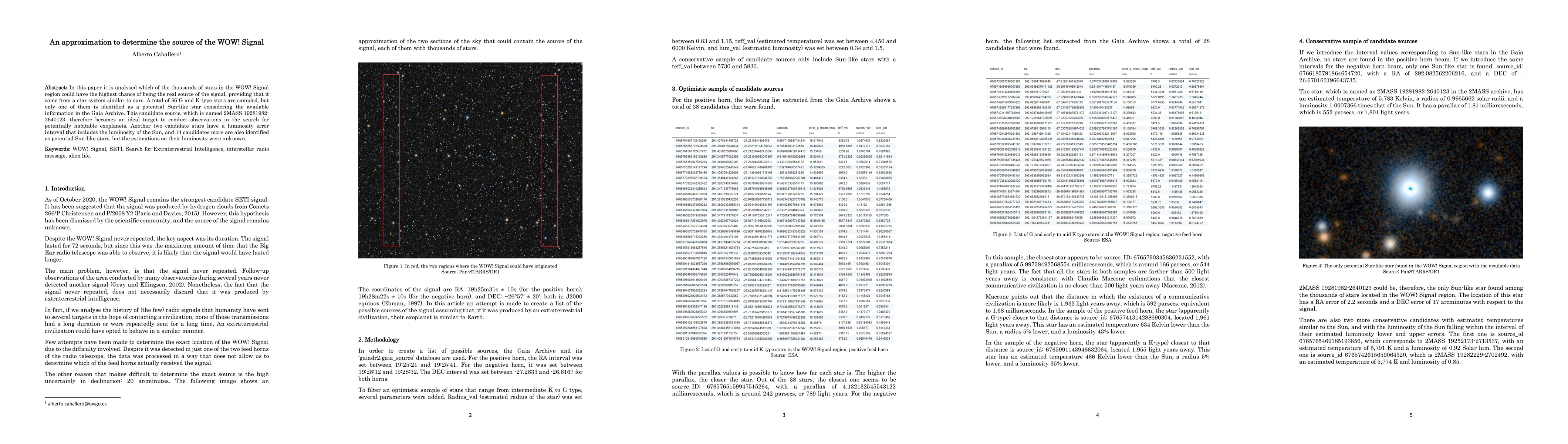 In this paper it is analysed which of the thousands of stars in the WOW! Signal region could have the highest chance of being the real source of the signal, providing that it came from a star system similar to ours. A total of 66 G and K-type stars are sampled, but only one of them is identified as a potential Sun-like star considering the available information in the Gaia Archive. This candidate source, which is named 2MASS 19281982-2640123, therefore becomes an ideal target to conduct observations in the search for potentially habitable exoplanets. Another two candidate stars have a luminosity error interval that includes the luminosity of the Sun, and 14 candidates more are also identified as potential Sun-like stars, but the estimations on their luminosity were unknown.