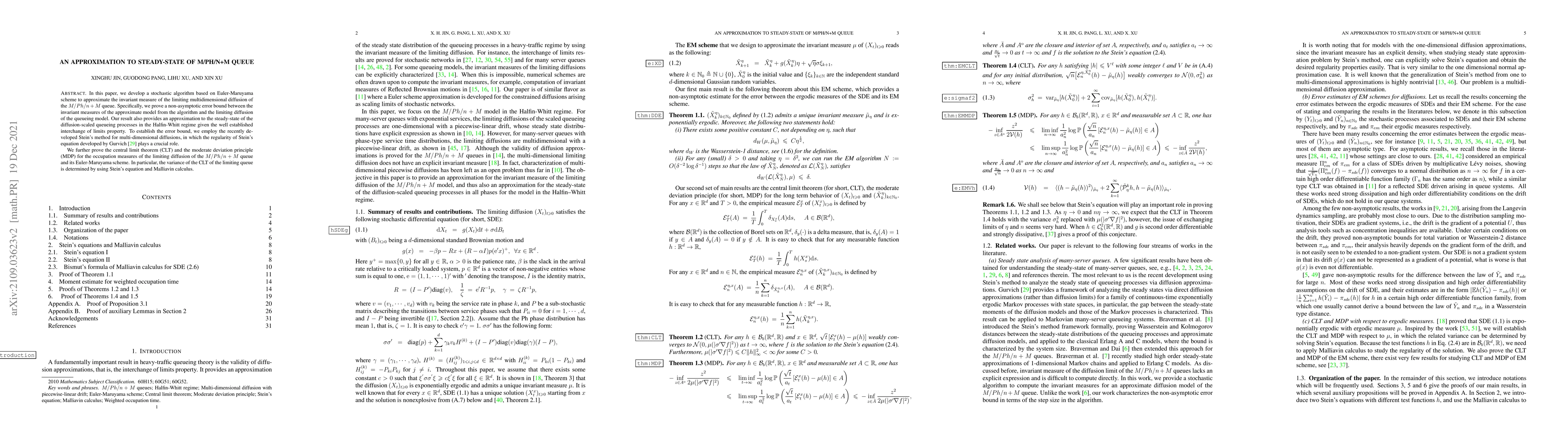 In this paper, we develop a stochastic algorithm based on Euler-Maruyama scheme to approximate the invariant measure of the limiting multidimensional diffusion of the $M/Ph/n+M$ queue. Specifically, we prove a non-asymptotic error bound between the invariant measures of the approximate model from the algorithm and the limiting diffusion of the queueing model. Our result also provides an approximation to the steady-state of the diffusion-scaled queueing processes in the Halfin-Whitt regime given the well established interchange of limits property. To establish the error bound, we employ the recently developed Stein's method for multi-dimensional diffusions, in which the regularity of Stein's equation developed by Gurvich \cite{Gur1} plays a crucial role. We further prove the central limit theorem (CLT) and the moderate deviation principle (MDP) for the occupation measures of the limiting diffusion of the $M/Ph/n+M$ queue and its Euler-Maruyama scheme. In particular, the variance of the CLT of the limiting queue is determined by using Stein's equation and Malliavin calculus.