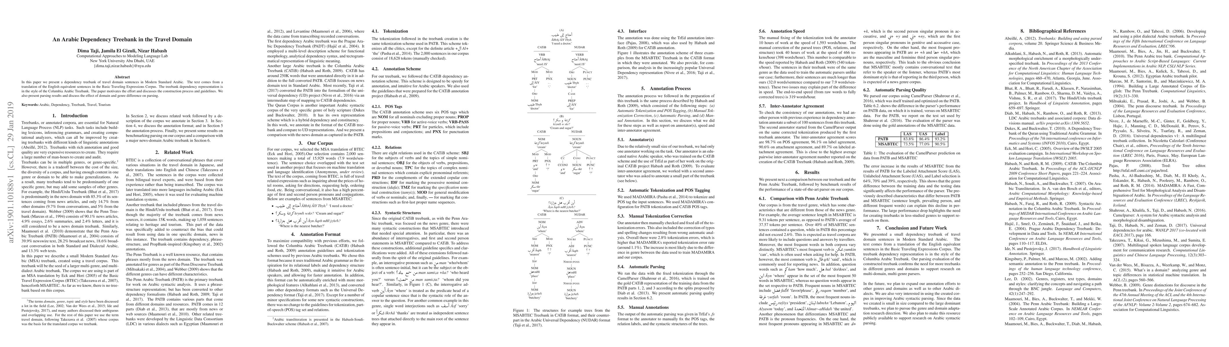 This paper presents a dependency treebank of travel domain sentences in Modern Standard Arabic, highlighting its construction process and parsing results. The study sheds light on the impact of domain and genre differences on parsing accuracy.