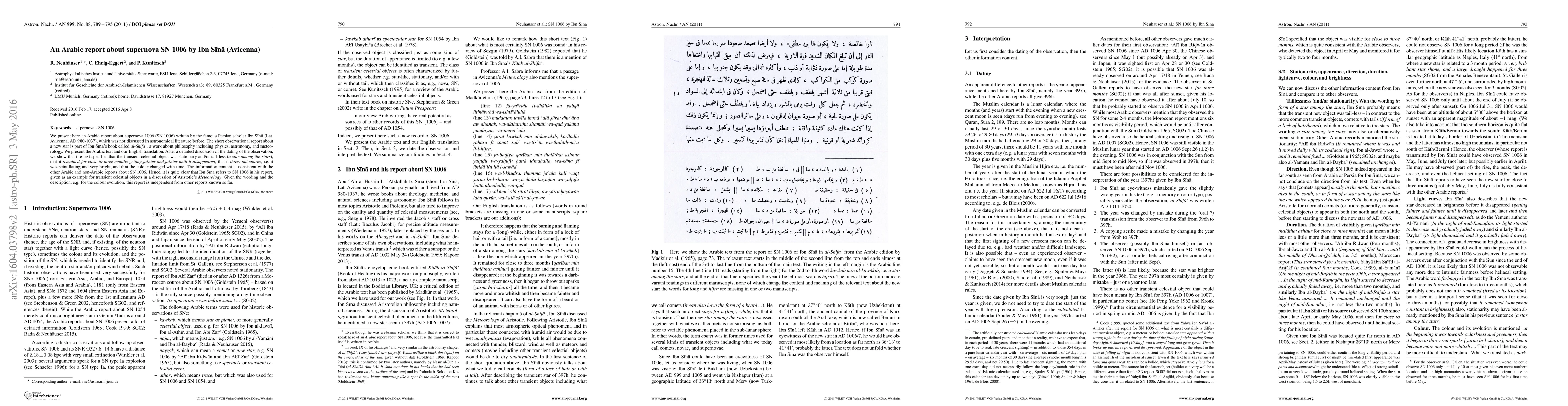 We present here an Arabic report about supernova 1006 (SN 1006) written by the famous Persian scholar Ibn Sina (Lat. Avicenna, AD 980-1037), which was not discussed in astronomical literature before. The short observational report about a new star is part of Ibn Sina's book called al-Shifa', a work about philosophy including physics, astronomy, and meteorology. We present the Arabic text and our English translation. After a detailed discussion of the dating of the observation, we show that the text specifies that the transient celestial object was stationary and/or tail-less ("a star among the stars"), that it "remained for close to three months getting fainter and fainter until it disappeared", that it "threw out sparks", i.e. it was scintillating and very bright, and that the color changed with time. The information content is consistent with the other Arabic and non-Arabic reports about SN 1006. Hence, it is quite clear that Ibn Sina refers to SN 1006 in his report, given as an example for transient celestial objects in a discussion of Aristotle's "Meteorology". Given the wording and the description, e.g. for the color evolution, this report is independent from other reports known so far.