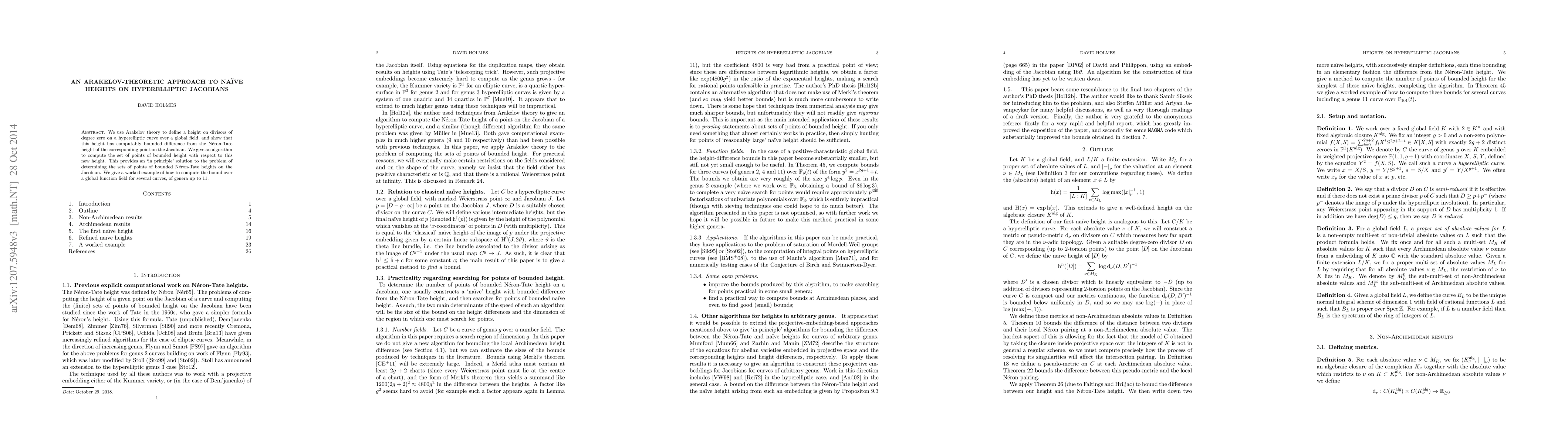 We use Arakelov theory to define a height on divisors of degree zero on a hyperelliptic curve over a global field, and show that this height has computably bounded difference from the N\'eron-Tate height of the corresponding point on the Jacobian. We give an algorithm to compute the set of points of bounded height with respect to this new height. This provides an `in principle' solution to the problem of determining the sets of points of bounded N\'eron-Tate heights on the Jacobian. We give a worked example of how to compute the bound over a global function field for several curves, of genera up to 11.