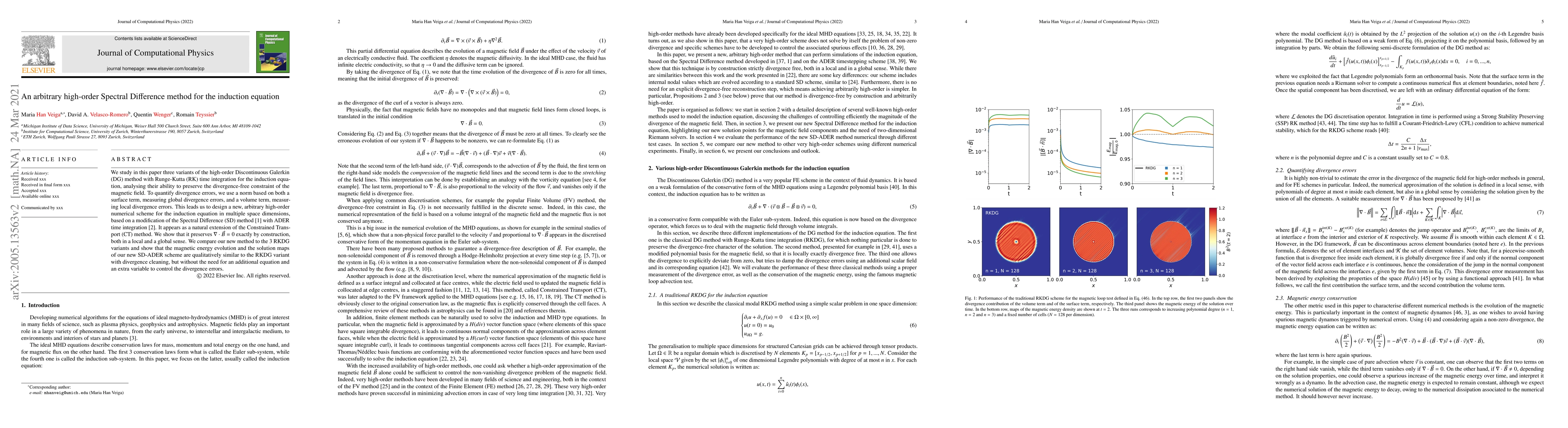We study in this paper three variants of the high-order Discontinuous Galerkin (DG) method with Runge-Kutta (RK) time integration for the induction equation, analysing their ability to preserve the divergence free constraint of the magnetic field. To quantify divergence errors, we use a norm based on both a surface term, measuring global divergence errors, and a volume term, measuring local divergence errors. This leads us to design a new, arbitrary high-order numerical scheme for the induction equation in multiple space dimensions, based on a modification of the Spectral Difference (SD) method [1] with ADER time integration [2]. It appears as a natural extension of the Constrained Transport (CT) method. We show that it preserves $\nabla\cdot\vec{B}=0$ exactly by construction, both in a local and a global sense. We compare our new method to the 3 RKDG variants and show that the magnetic energy evolution and the solution maps of our new SD-ADER scheme are qualitatively similar to the RKDG variant with divergence cleaning, but without the need for an additional equation and an extra variable to control the divergence errors. [1] Liu Y., Vinokur M., Wang Z.J. (2006) Discontinuous Spectral Difference Method for Conservation Laws on Unstructured Grids. In: Groth C., Zingg D.W. (eds) Computational Fluid Dynamics 2004. Springer, Berlin, Heidelberg [2] Dumbser M., Castro M., Par\'es C., Toro E.F (2009) ADER schemes on unstructured meshes for nonconservative hyperbolic systems: Applications to geophysical flows. In: Computers & Fluids, Volume 38, Issue 9