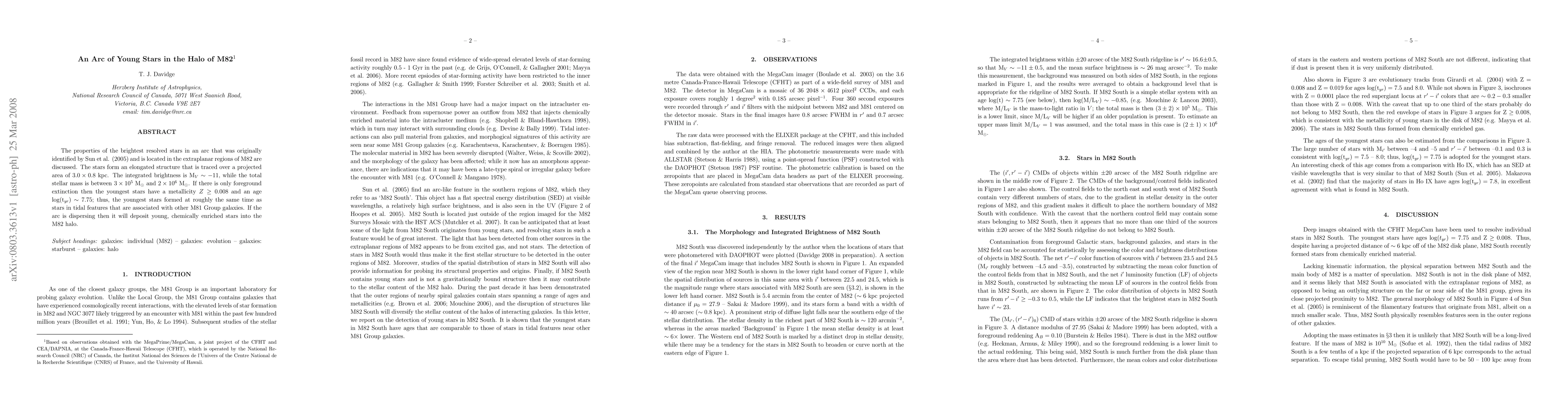 The properties of the brightest resolved stars in an arc that was originally identified by Sun et al. (2005) and is located in the extraplanar regions of M82 are discussed. The stars form an elongated structure that is traced over a projected area of 3.0 x 0.8 kpc. The integrated brightness is M_V ~ -11, while the total stellar mass is between 3 x 10^5 and 2 x 10^6 solar masses. If there is only foreground extinction then the youngest stars have a metallicity Z > 0.008 and an age log(tyears) ~ 7.75; thus, the youngest stars formed at roughly the same time as stars in tidal features that are associated with other M81 Group galaxies. If the arc is dispersing then it will deposit young, chemically enriched stars into the M82 halo.