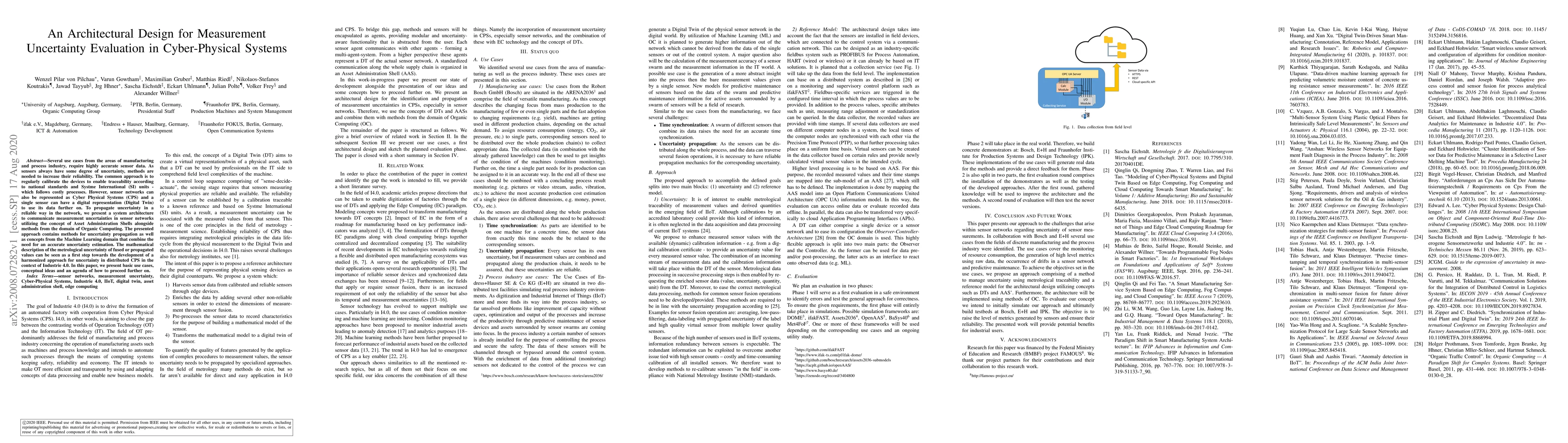 Several use cases from the areas of manufacturing and process industry, require highly accurate sensor data. As sensors always have some degree of uncertainty, methods are needed to increase their reliability. The common approach is to regularly calibrate the devices to enable traceability according to national standards and Syst\`eme international (SI) units - which follows costly processes. However, sensor networks can also be represented as Cyber Physical Systems (CPS) and a single sensor can have a digital representation (Digital Twin) to use its data further on. To propagate uncertainty in a reliable way in the network, we present a system architecture to communicate measurement uncertainties in sensor networks utilizing the concept of Asset Administration Shells alongside methods from the domain of Organic Computing. The presented approach contains methods for uncertainty propagation as well as concepts from the Machine Learning domain that combine the need for an accurate uncertainty estimation. The mathematical description of the metrological uncertainty of fused or propagated values can be seen as a first step towards the development of a harmonized approach for uncertainty in distributed CPSs in the context of Industrie 4.0. In this paper, we present basic use cases, conceptual ideas and an agenda of how to proceed further on.