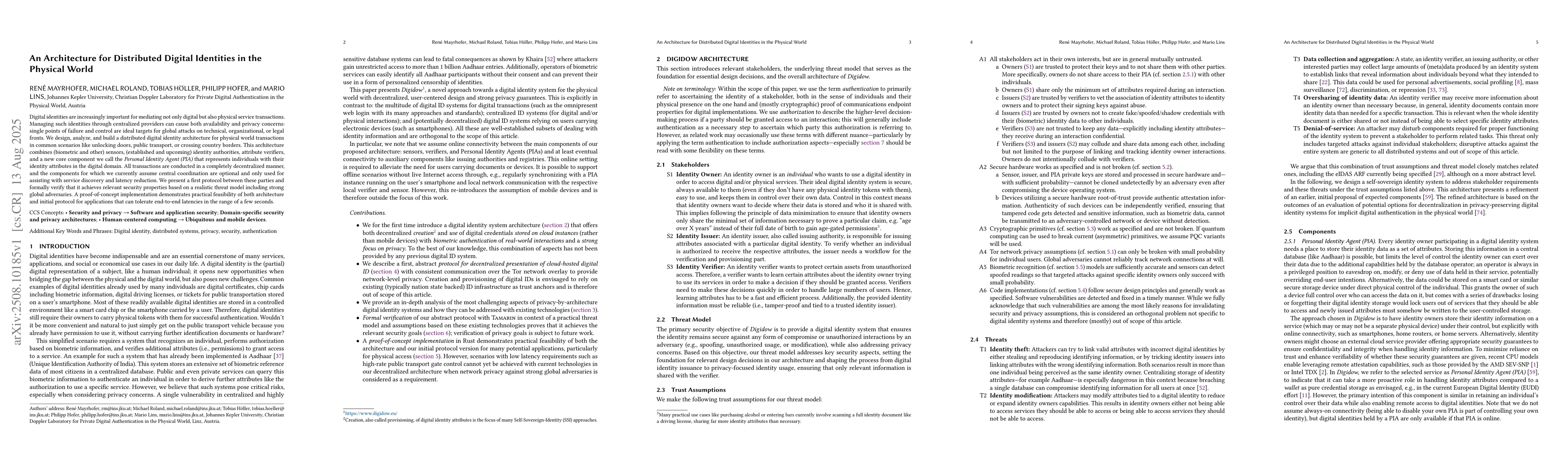 Digital identities are increasingly important for mediating not only digital but also physical service transactions. Managing such identities through centralized providers can cause both availability and privacy concerns: single points of failure and control are ideal targets for global attacks on technical, organizational, or legal fronts. We design, analyze, and build a distributed digital identity architecture for physical world transactions in common scenarios like unlocking doors, public transport, or crossing country borders. This architecture combines (biometric and other) sensors, (established and upcoming) identity authorities, attribute verifiers, and a new core component we call the \emph{Personal Identity Agent (PIA)} that represents individuals with their identity attributes in the digital domain. All transactions are conducted in a completely decentralized manner, and the components for which we currently assume central coordination are optional and only used for assisting with service discovery and latency reduction. We present a first protocol between these parties and formally verify that it achieves relevant security properties based on a realistic threat model including strong global adversaries. A proof-of-concept implementation demonstrates practical feasibility of both architecture and initial protocol for applications that can tolerate end-to-end latencies in the range of a few seconds.
