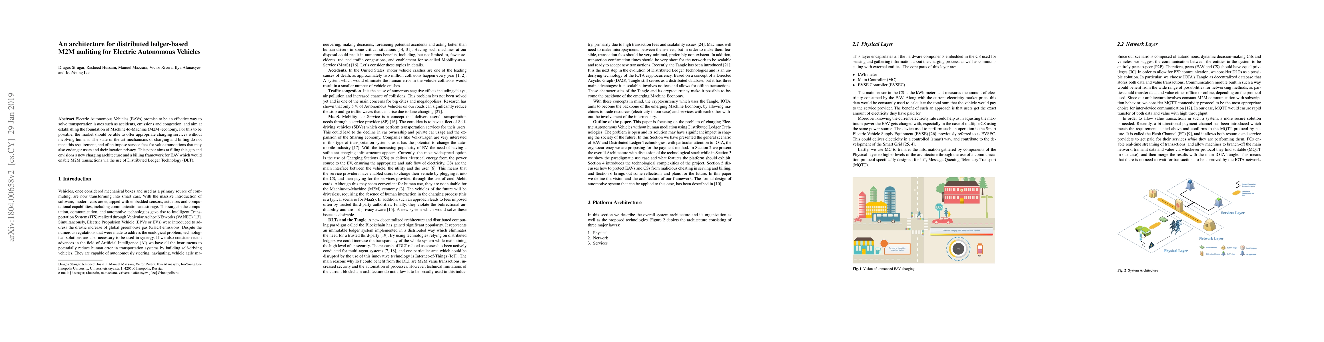 This paper proposes a new architecture for distributed ledger-based M2M auditing for Electric Autonomous Vehicles (EAVs) to facilitate automated charging and billing without human intervention, ensuring privacy and eliminating service fees. It leverages Distributed Ledger Technology to enhance security and efficiency in the M2M economy.