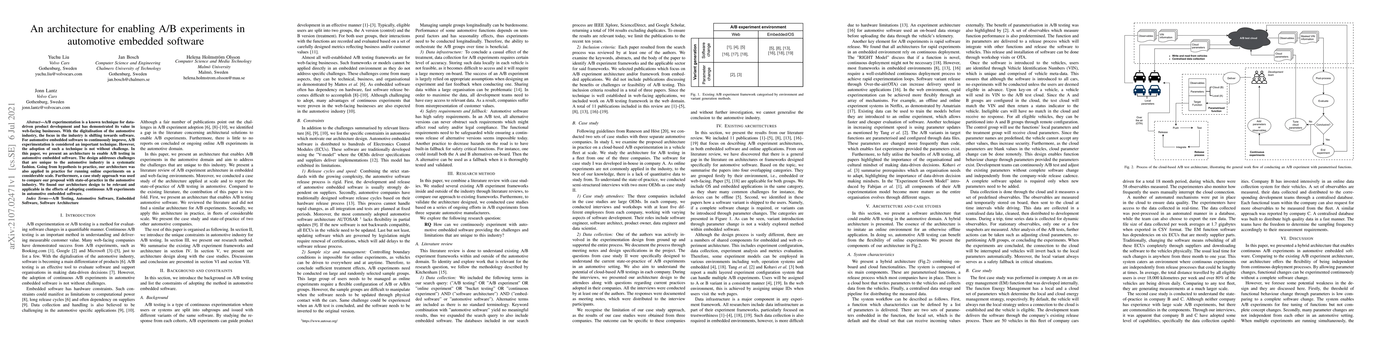 This paper presents an architecture for enabling A/B testing in automotive embedded software, addressing unique industry challenges and demonstrating its practical application through a case study. The proposed design shows relevance and applicability for continuous improvement in automotive software development.
