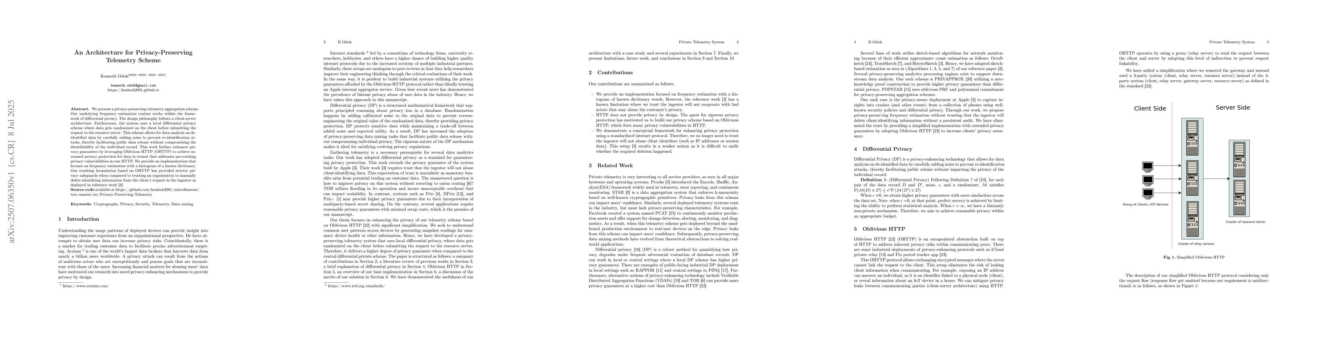 This paper introduces a privacy-preserving telemetry aggregation scheme using differential privacy and local randomization on clients. It enhances privacy by employing Oblivious HTTP (OHTTP) for secure data transmission, providing stricter safeguards than manual deletion methods. An implementation for frequency estimation with histograms is offered, with code available on GitHub.