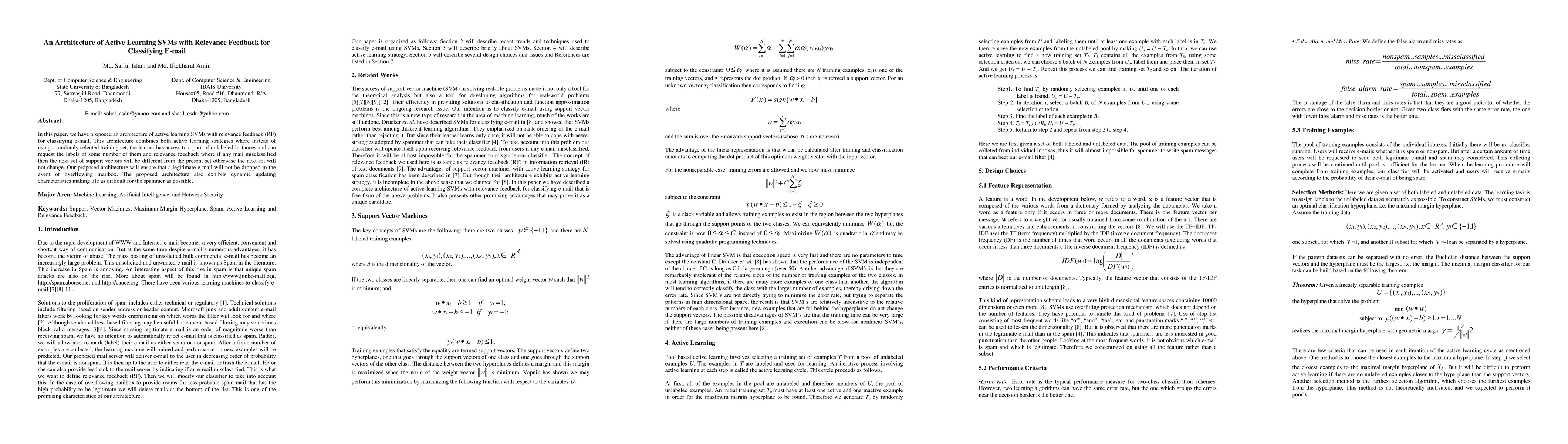 In this paper, we have proposed an architecture of active learning SVMs with relevance feedback (RF)for classifying e-mail. This architecture combines both active learning strategies where instead of using a randomly selected training set, the learner has access to a pool of unlabeled instances and can request the labels of some number of them and relevance feedback where if any mail misclassified then the next set of support vectors will be different from the present set otherwise the next set will not change. Our proposed architecture will ensure that a legitimate e-mail will not be dropped in the event of overflowing mailbox. The proposed architecture also exhibits dynamic updating characteristics making life as difficult for the spammer as possible.