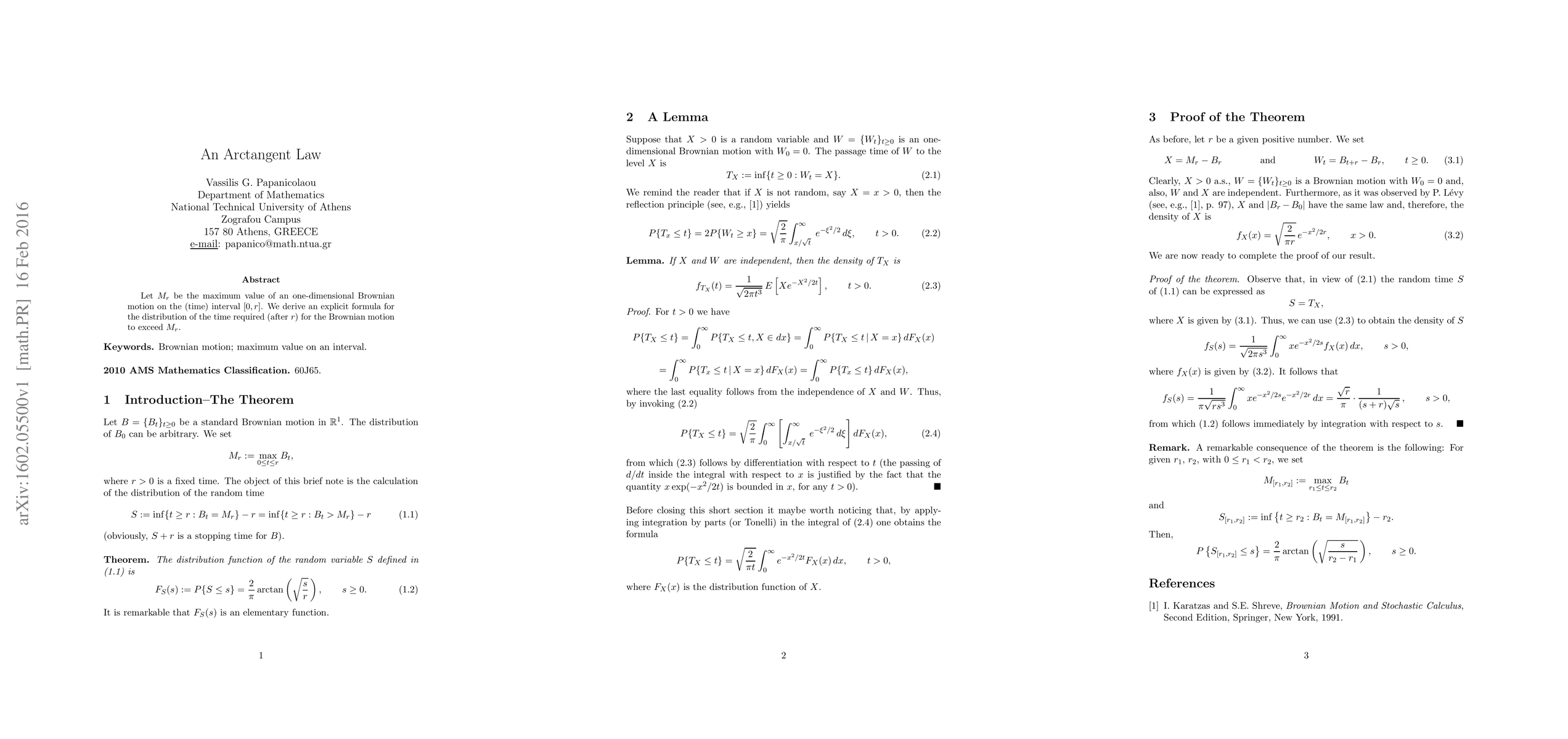 Let $M_r$ be the maximum value of an one-dimensional Brownian motion on the (time) interval $[0, r]$. We derive an explicit formula for the distribution of the time required (after $r$) for the Brownian motion to exceed $M_r$.