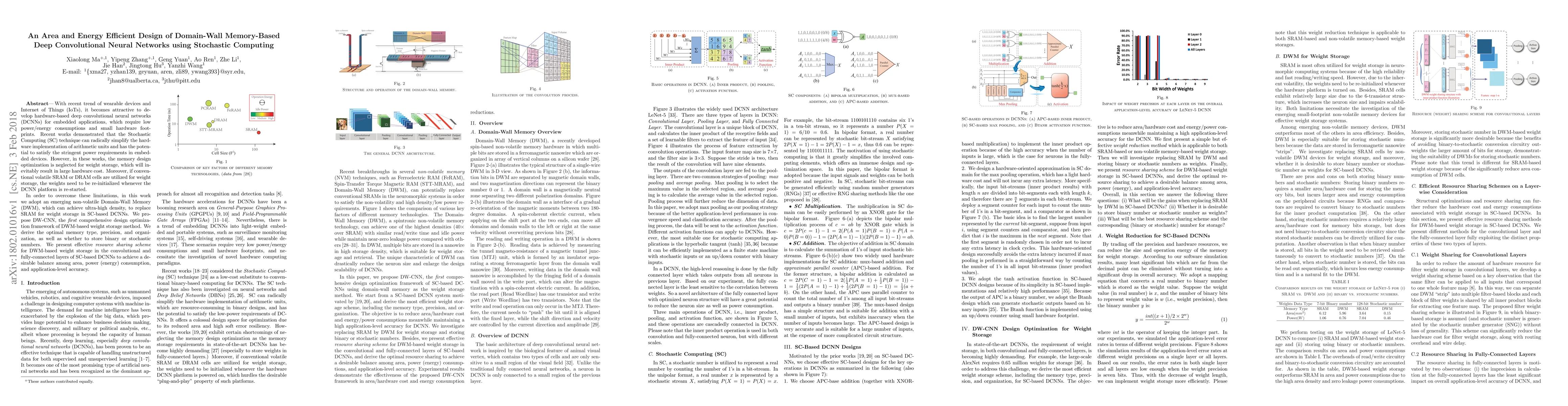 This paper proposes a novel design framework for domain-wall memory (DWM) to optimize weight storage in stochastic computing-based deep convolutional neural networks (DCNNs), aiming to achieve low power consumption and high energy efficiency for embedded applications. The DW-CNN framework optimizes memory type, precision, and organization to balance area, power consumption, and accuracy.