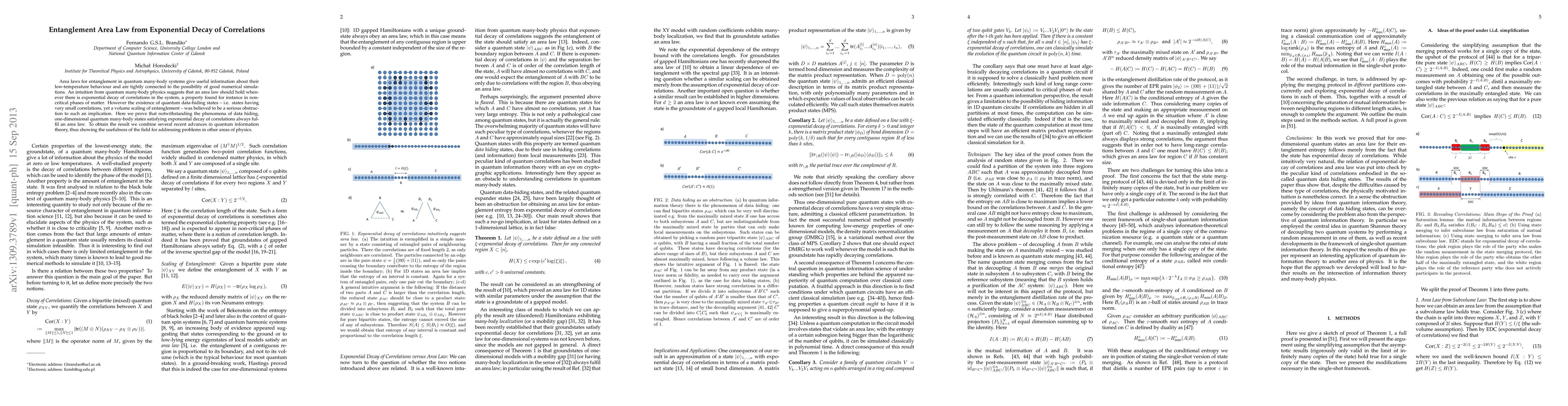 This paper proves that one-dimensional quantum many-body states exhibiting exponential decay of correlations always adhere to an area law, despite the presence of quantum data-hiding states. This result leverages recent advances in quantum information theory to bridge insights from quantum physics and numerical simulations.