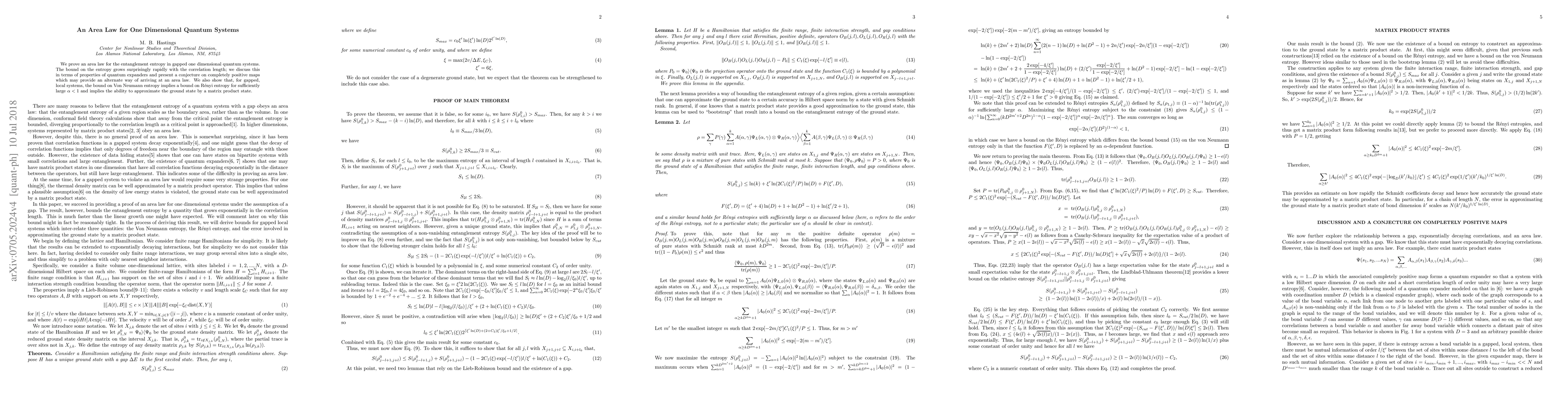 This paper proves an area law for the entanglement entropy in one-dimensional gapped quantum systems, showing that the entropy grows rapidly with correlation length. It also conjectures a method using completely positive maps to achieve an area law and demonstrates that bounds on Von Neumann entropy imply bounds on Rényi entropy and the ability to approximate ground states with matrix product states.
