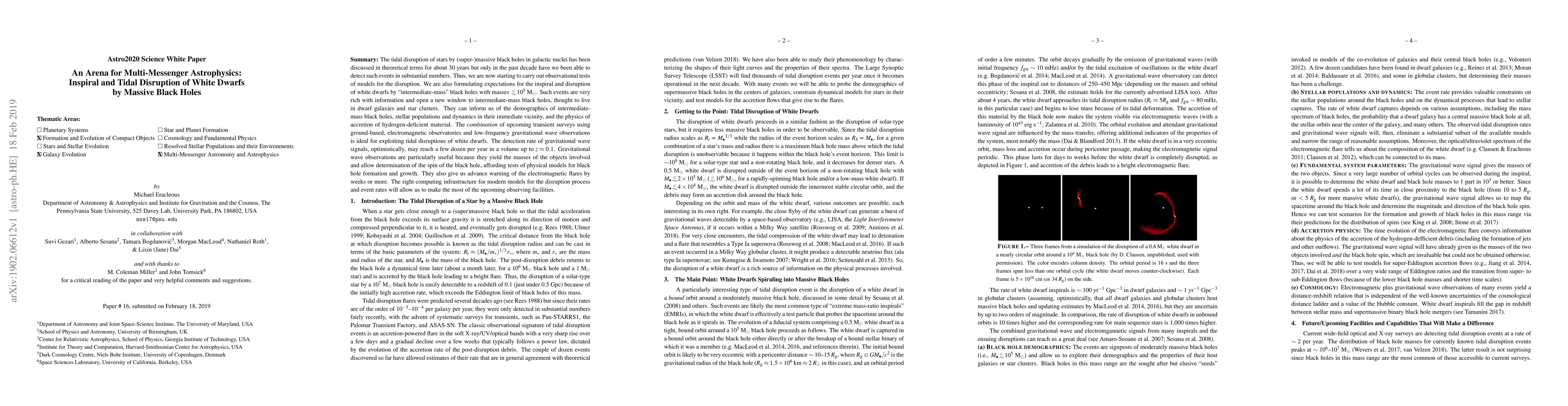 The tidal disruption of stars by (super-)massive black holes in galactic nuclei has been discussed in theoretical terms for about 30 years but only in the past decade have we been able to detect such events in substantial numbers. Thus, we are now starting to carry out observational tests of models for the disruption. We are also formulating expectations for the inspiral and disruption of white dwarfs by intermediate-mass black holes with masses $< 10^5\;{\rm M}_\odot$. Such events are very rich with information and open a new window to intermediate-mass black holes, thought to live in dwarf galaxies and star clusters. They can inform us of the demographics of intermediate-mass black holes, stellar populations and dynamics in their immediate vicinity, and the physics of accretion of hydrogen-deficient material. The combination of upcoming transient surveys using ground-based, electromagnetic observatories and low-frequency gravitational wave observations is ideal for exploiting tidal disruptions of white dwarfs. The detection rate of gravitational wave signals, optimistically, may reach a few dozen per year in a volume up to $z\approx 0.1$. Gravitational wave observations are particularly useful because they yield the masses of the objects involved and allow determination of the spin of the black hole, affording tests of physical models for black hole formation and growth. They also give us advance warning of the electromagnetic flares by weeks or more. The right computing infrastructure for modern models for the disruption process and event rates will allow us to make the most of the upcoming observing facilities.