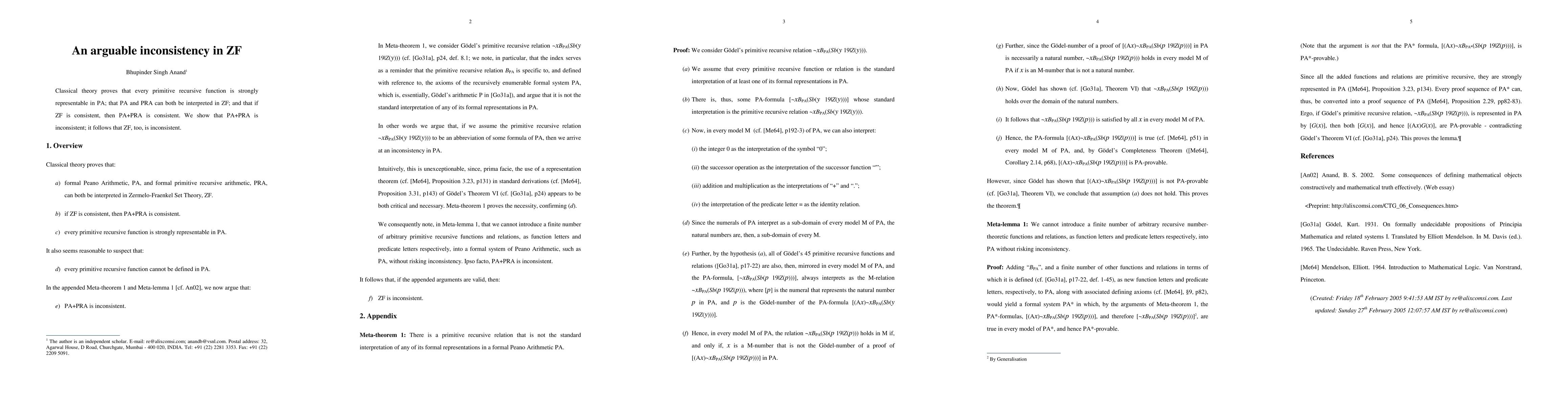 Classical theory proves that every primitive recursive function is strongly representable in PA; that formal Peano Arithmetic, PA, and formal primitive recursive arithmetic, PRA, can both be interpreted in Zermelo-Fraenkel Set Theory, ZF; and that if ZF is consistent, then PA+PRA is consistent. We show that PA+PRA is inconsistent; it follows that ZF, too, is inconsistent.