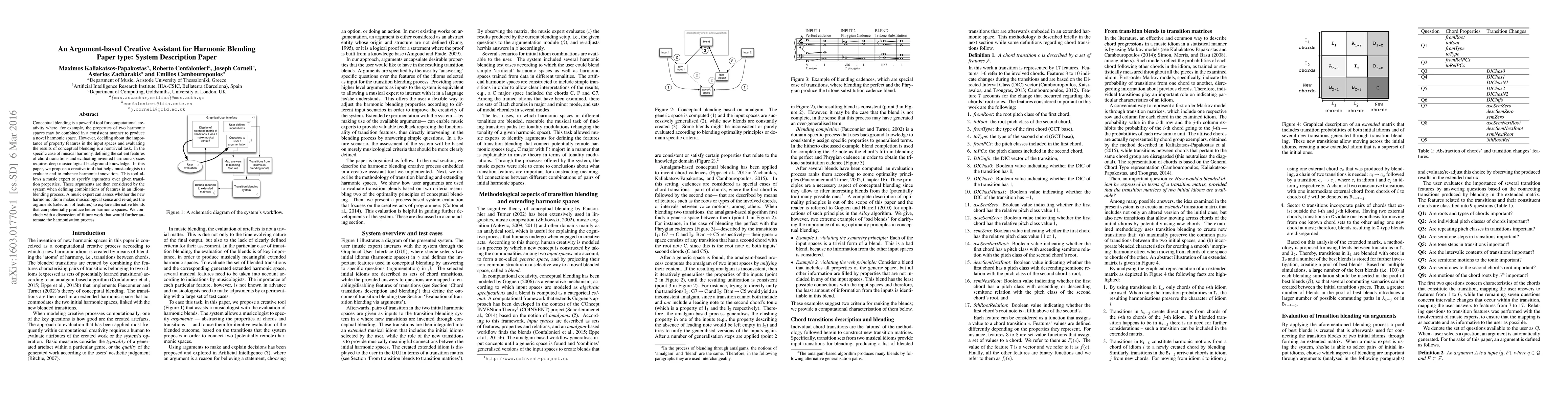 Conceptual blending is a powerful tool for computational creativity where, for example, the properties of two harmonic spaces may be combined in a consistent manner to produce a novel harmonic space. However, deciding about the importance of property features in the input spaces and evaluating the results of conceptual blending is a nontrivial task. In the specific case of musical harmony, defining the salient features of chord transitions and evaluating invented harmonic spaces requires deep musicological background knowledge. In this paper, we propose a creative tool that helps musicologists to evaluate and to enhance harmonic innovation. This tool allows a music expert to specify arguments over given transition properties. These arguments are then considered by the system when defining combinations of features in an idiom-blending process. A music expert can assess whether the new harmonic idiom makes musicological sense and re-adjust the arguments (selection of features) to explore alternative blends that can potentially produce better harmonic spaces. We conclude with a discussion of future work that would further automate the harmonisation process.