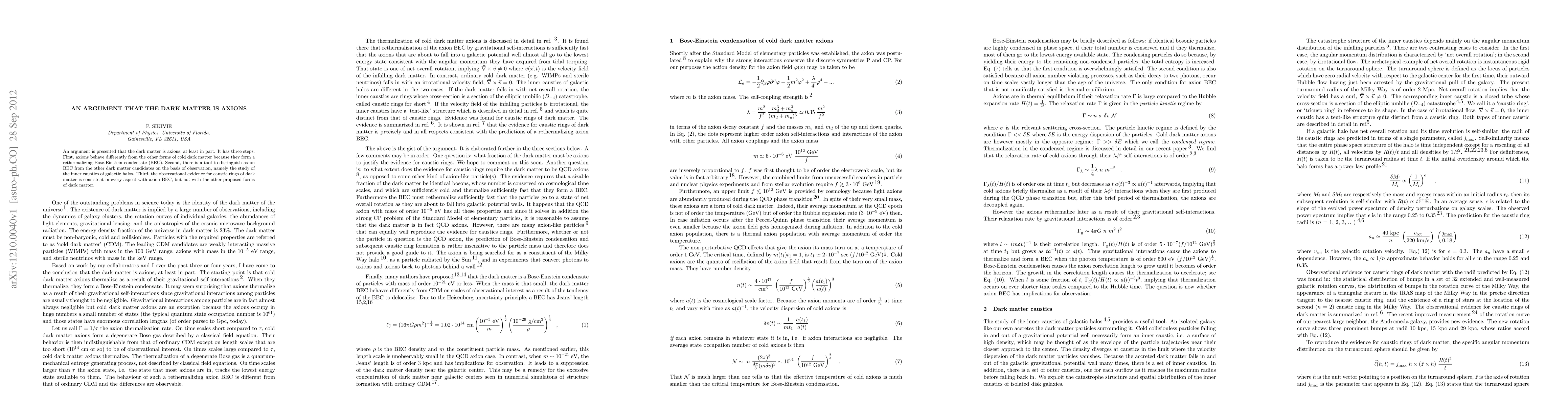 An argument is presented that the dark matter is axions, at least in part. It has three steps. First, axions behave differently from the other forms of cold dark matter because they form a rethermalizing Bose-Einstein condensate (BEC). Second, there is a tool to distinguish axion BEC from the other dark matter candidates on the basis of observation, namely the study of the inner caustics of galactic halos. Third, the observational evidence for caustic rings of dark matter is consistent in every aspect with axion BEC, but not with the other proposed forms of dark matter.