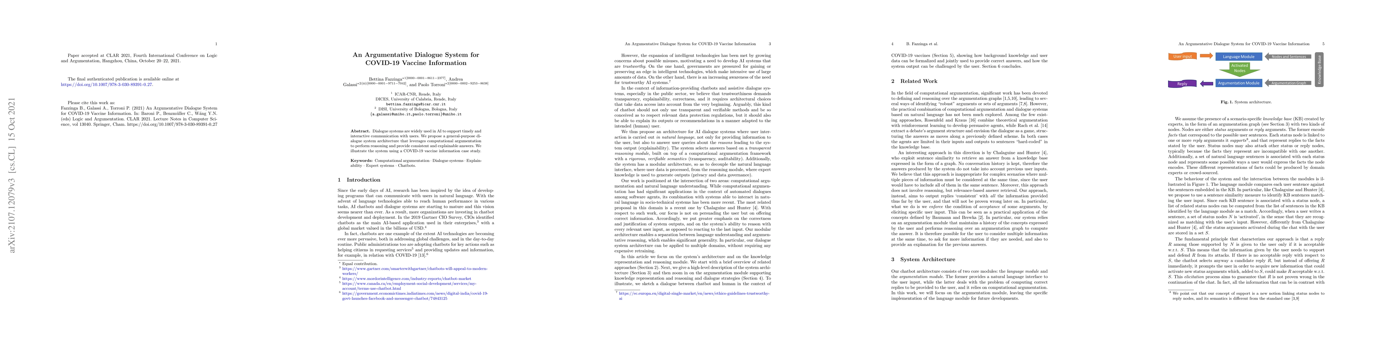 A dialogue system was developed to provide consistent and explainable answers on COVID-19 vaccine information through computational argumentation. The system leverages a general-purpose architecture for timely and interactive communication with users.