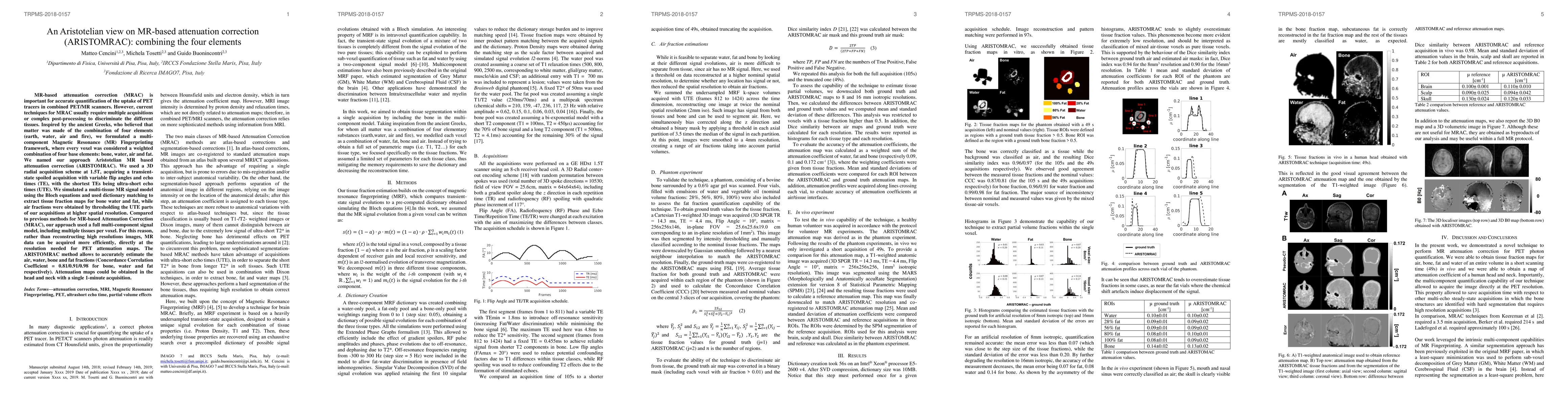 The ARISTOMRAC method proposes a novel MR-based attenuation correction technique for PET/MR imaging using a multi-component MR Fingerprinting framework inspired by Aristotle's four elements. This approach efficiently estimates bone, water, air, and fat fractions, enabling accurate attenuation maps in a single 1-minute acquisition.