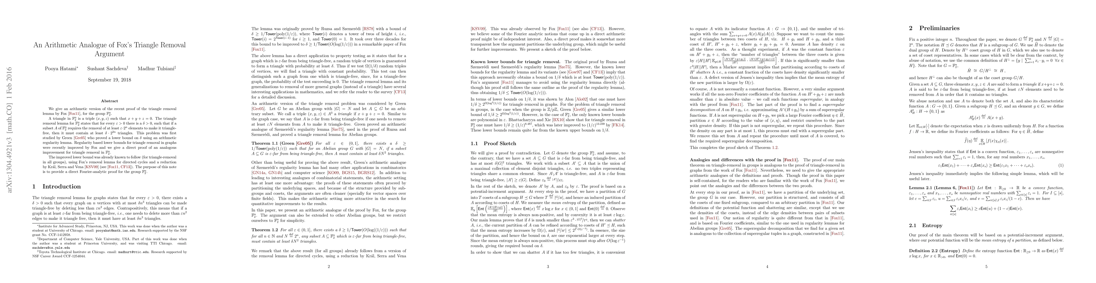 We give an arithmetic version of the recent proof of the triangle removal lemma by Fox [Fox11], for the group $\mathbb{F}_2^n$. A triangle in $\mathbb{F}_2^n$ is a triple $(x,y,z)$ such that $x+y+z = 0$. The triangle removal lemma for $\mathbb{F}_2^n$ states that for every $\epsilon > 0$ there is a $\delta > 0$, such that if a subset $A$ of $\mathbb{F}_2^n$ requires the removal of at least $\epsilon \cdot 2^n$ elements to make it triangle-free, then it must contain at least $\delta \cdot 2^{2n}$ triangles. This problem was first studied by Green [Gre05] who proved a lower bound on $\delta$ using an arithmetic regularity lemma. Regularity based lower bounds for triangle removal in graphs were recently improved by Fox and we give a direct proof of an analogous improvement for triangle removal in $\mathbb{F}_2^n$. The improved lower bound was already known to follow (for triangle-removal in all groups), using Fox's removal lemma for directed cycles and a reduction by Kr\'{a}l, Serra and Vena [KSV09] (see [Fox11,CF13]). The purpose of this note is to provide a direct Fourier-analytic proof for the group $\mathbb{F}_2^n.$