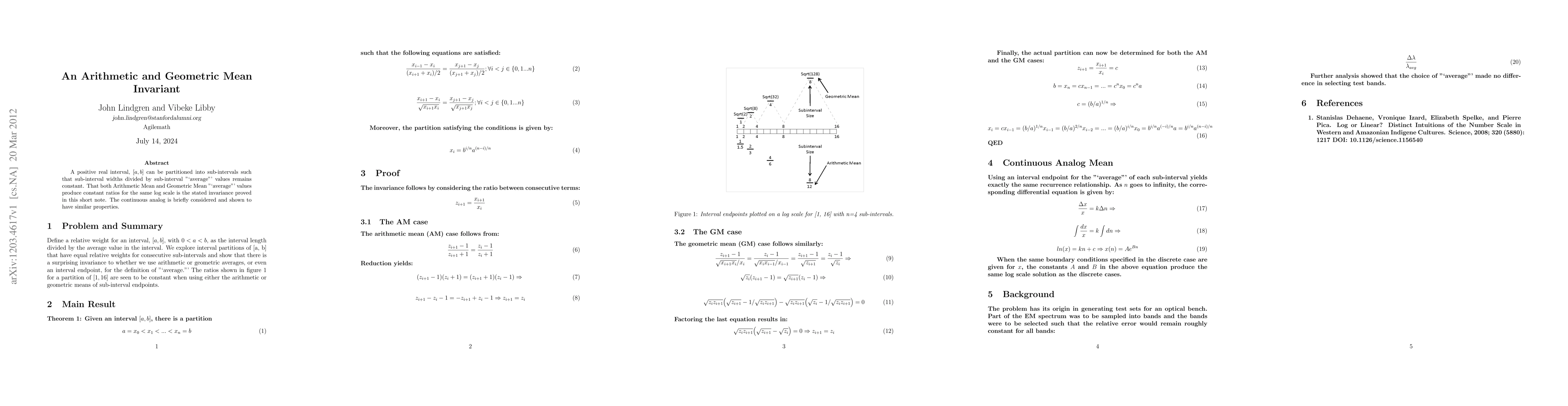 This research proves that for any positive real interval [a, b], partitioning it maintains a constant ratio when sub-interval widths are divided by their 'average' values, calculated using both Arithmetic and Geometric Means. The paper also explores the continuous analog, confirming similar properties.