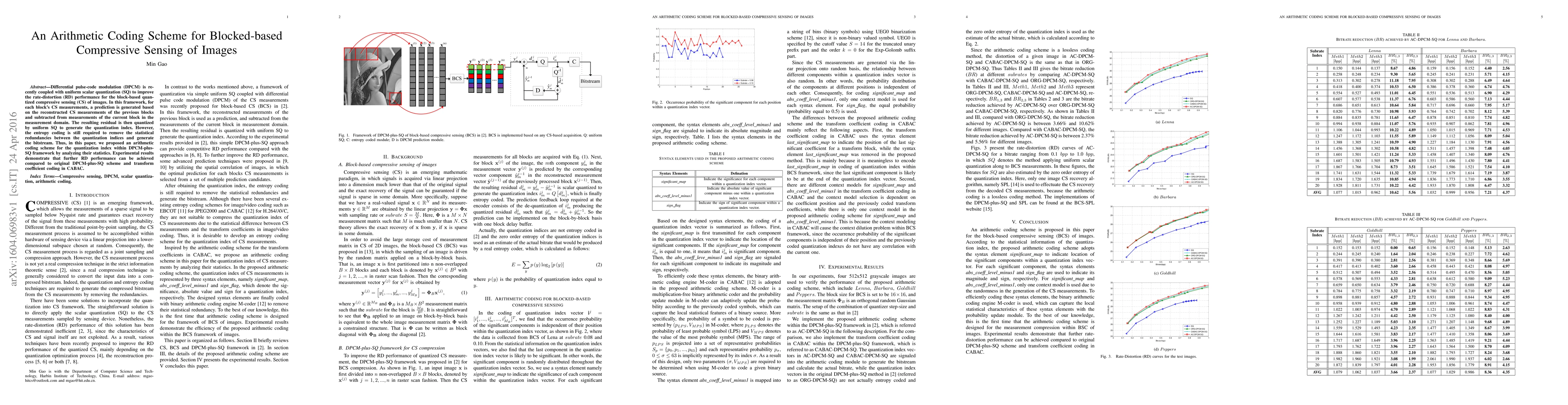 Differential pulse-code modulation (DPCM) is recently coupled with uniform scalar quantization (SQ) to improve the rate-distortion (RD) performance for the block-based quantized compressive sensing (CS) of images. In this framework, for each block's CS measurements, a prediction is generated based on the reconstructed CS measurements of the previous blocks and subtracted from measurements of the current block in the measurement domain. The resulting residual is then quantized by uniform SQ to generate the quantization index. However, the entropy coding is still required to remove the statistical redundancies between the quantization indices and generate the bitstream. Thus, in this paper, we proposed an arithmetic coding scheme for the quantization index within DPCM-plus-SQ framework by analyzing their statistics. Experimental results demonstrate that further RD performance can be achieved compared to original DPCM-plus-SQ scheme and transform coefficient coding in CABAC.