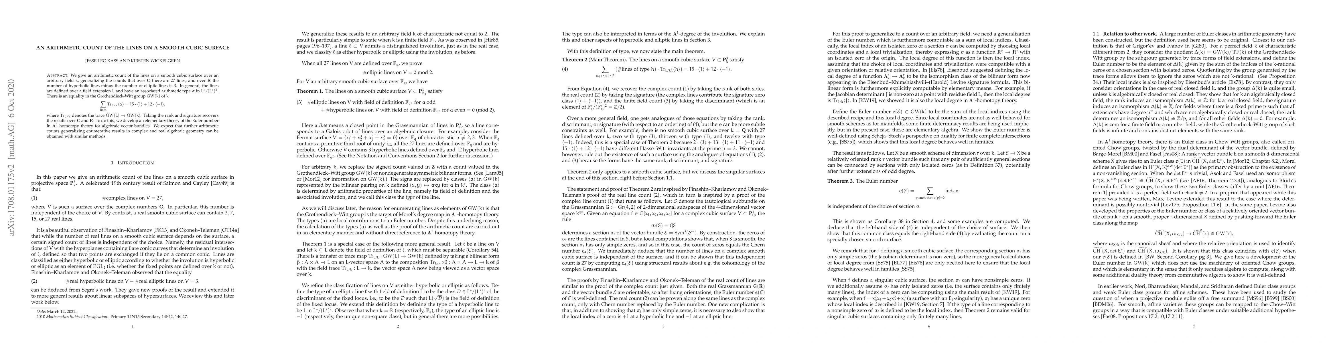 This paper generalizes the count of lines on smooth cubic surfaces over arbitrary fields, establishing an arithmetic equality in the Grothendieck-Witt group and relating it to the rank and signature. It develops a new $\mathbb{A}^1$-homotopy theory framework for algebraic vector bundles to achieve this.